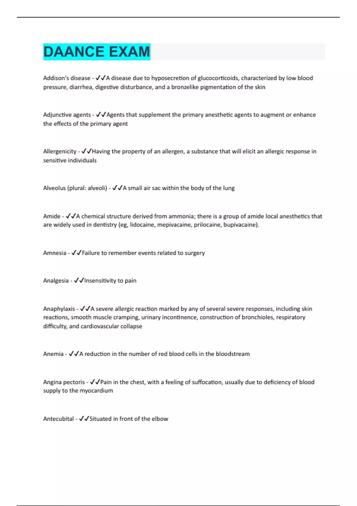 Addison's disease - A disease due to hyposecretion of glucocorticoids, characterized by low blood pressure, diarrhea, digestive disturbance, and a bronzelike pigmentation of the skin Adjunctive agents - Agents that supplement the primary anesthetic agents to augment or enhance the effects of the primary agent Allergenicity - Having the property of an allergen, a substance that will elicit an allergic response in sensitive individuals Alveolus (plural: alveoli) - A small air sac within the body of the lung Amide - A chemical structure derived from ammonia; there is a group of amide local anesthetics that are widely used in dentistry (eg, lidocaine, mepivacaine, prilocaine, bupivacaine). Amnesia - Failure to remember events related to surgery Analgesia - Insensitivity to pain Anaphylaxis - A severe allergic reaction marked by any of several severe responses, including skin reactions, smooth muscle cramping, urinary incontinence, construction of bronchioles, respiratory difficulty, and cardiovascular collapse Anemia - A reduction in the number of red blood cells in the bloodstream Angina pectoris - Pain in the chest, with a feeling of suffocation, usually due to deficiency of blood supply to the myocardium Antecubital - Situated in front of the elbow