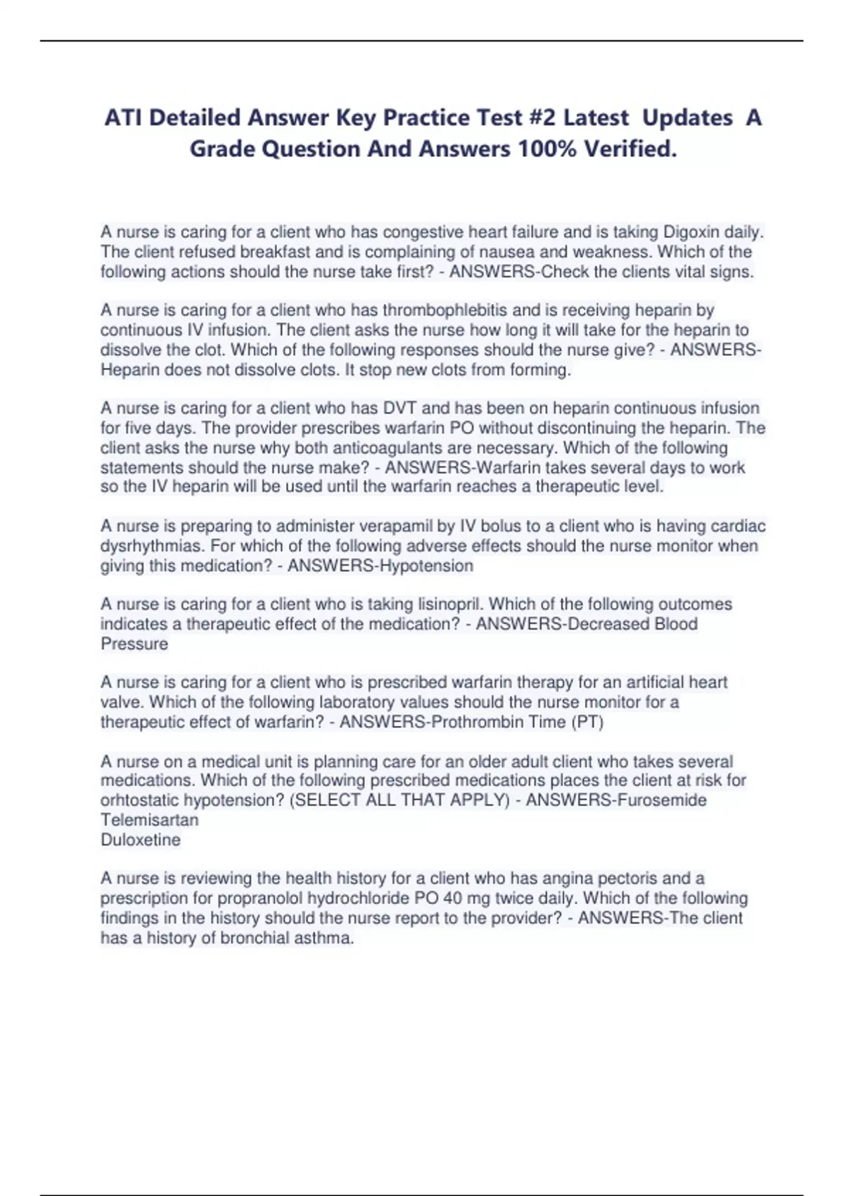 ATI Detailed Answer Key Practice Test #2 Latest Updates A Grade Question And Answers 100% Verified. A nurse is caring for a client who has congestive heart failure and is taking Digoxin daily. The client refused breakfast and is complaining of nausea and weakness. Which of the following actions should the nurse take first? - ANSWERS-Check the clients vital signs. A nurse is caring for a client who has thrombophlebitis and is receiving heparin by continuous IV infusion. The client asks the nurse how long it will take for the heparin to dissolve the clot. Which of the following responses should the nurse give? - ANSWERSHeparin does not dissolve clots. It stop new clots from forming. A nurse is caring for a client who has DVT and has been on heparin continuous infusion for five days. The provider prescribes warfarin PO without discontinuing the heparin. The client asks the nurse why both anticoagulants are necessary. Which of the following statements should the nurse make? - ANSWERS-Warfarin takes several days to work so the IV heparin will be used until the warfarin reaches a therapeutic level. A nurse is preparing to administer verapamil by IV bolus to a client who is having cardiac dysrhythmias. For which of the following adverse effects should the nurse monitor when giving this medication? - ANSWERS-Hypotension A nurse is caring for a client who is taking lisinopril. Which of the following outcomes indicates a therapeutic effect of the medication? - ANSWERS-Decreased Blood Pressure A nurse is caring for a client who is prescribed warfarin therapy for an artificial heart valve. Which of the following laboratory values should the nurse monitor for a therapeutic effect of warfarin? - ANSWERS-Prothrombin Time (PT) A nurse on a medical unit is planning care for an older adult client who takes several medications. Which of the following prescribed medications places the client at risk for orhtostatic hypotension? (SELECT ALL THAT APPLY) - ANSWERS-Furosemide Telemisartan Duloxetine A nurse is reviewing the health history for a client who has angina pectoris and a prescription for propranolol hydrochloride PO 40 mg twice daily. Which of the following findings in the history should the nurse report to the provider? - ANSWERS-The client has a history of bronchial asthma. A nurse is providing teaching for a client who has a new prescription for warfarin. Which of the following instructions should the nurse include in the teaching? - ANSWERS-Use an electric razor while on this medication. A nurse in the emergency department is caring for a client who took three nitroglycerin tablets sublingually for chest pain. The client reports relief from the chest pain but now he is experiencing a headache. Which of the following statements should the nurse make? - ANSWERS-A headache is an expected adverse effect of the medication. A nurse is preparing to administer heparin to a client. Which of the following actions should the nurse plan to take? - ANSWERS-Inject the medication into the abdomen above the level of the iliac crest. A nurse is teaching a client who has a new prescription for transdermal nitroglycerin to treat angina pectoris. Which of the following instructions should the nurse include in the teaching? - ANSWERS-Apply the transdermal patch in the morning. A nurse is caring for a client who is having thrombophlebitis and is receiving a continuous heparin infusion. Which of the following medications should the nurse have available to reverse heparins effects? - ANSWERS-Protamine Sulfate