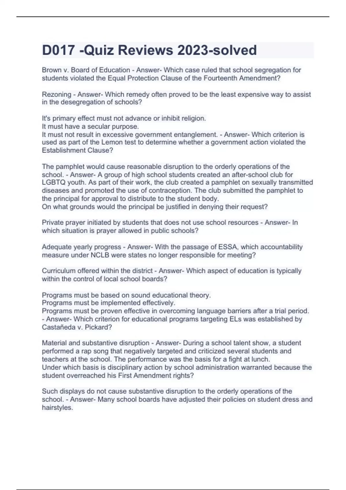 Brown v. Board of Education - Answer- Which case ruled that school segregation for students violated the Equal Protection Clause of the Fourteenth Amendment? Rezoning - Answer- Which remedy often proved to be the least expensive way to assist in the desegregation of schools? It's primary effect must not advance or inhibit religion. It must have a secular purpose. It must not result in excessive government entanglement. - Answer- Which criterion is used as part of the Lemon test to determine whether a government action violated the Establishment Clause? The pamphlet would cause reasonable disruption to the orderly operations of the school. - Answer- A group of high school students created an after-school club for LGBTQ youth. As part of their work, the club created a pamphlet on sexually transmitted diseases and promoted the use of contraception. The club submitted the pamphlet to the principal for approval to distribute to the student body. On what grounds would the principal be justified in denying their request? Private prayer initiated by students that does not use school resources - Answer- In which situation is prayer allowed in public schools? Adequate yearly progress - Answer- With the passage of ESSA, which accountability measure under NCLB were states no longer responsible for meeting? Curriculum offered within the district - Answer- Which aspect of education is typically within the control of local school boards? Programs must be based on sound educational theory. Programs must be implemented effectively. Programs must be proven effective in overcoming language barriers after a trial period. - Answer- Which criterion for educational programs targeting ELs was established by Castañeda v. Pickard? Material and substantive disruption - Answer- During a school talent show, a student performed a rap song that negatively targeted and criticized several students and teachers at the school. The performance was the basis for a fight at lunch. Under which basis is disciplinary action by school administration warranted because the student overreached his First Amendment rights? Such displays do not cause substantive disruption to the orderly operations of the school. - Answer- Many school boards have adjusted their policies on student dress and hairstyles. What is the major influence on these decisions? Reasonable suspicion - Answer- A principal receives a call from a parent stating that her child informed her of a student who has been selling drugs at school. Which legal right gives school personnel the authority to search the student's locker and personal belongings? Quietly interview the students listed to determine the reasonableness of a search. - Answer- The Dean of students at a local high school received an anonymous email accusing the senior class President of selling drugs from his locker. The email included the class President's locker combination and a price list for the drugs, along with names of students who allegedly purchased the drugs. What is the appropriate administrative action based on this email? Freedom of Speech - Answer- An assistant principal noticed two seventh-grade girls wearing controversial rock band T-shirts as they boarded the school bus for a field trip. The assistant principal removed the students and told them they could not go on the trip. The students were given in-school suspensions as an alternative. Which right did the assistant principal violate? Due Process - Answer- An administrator suspends a student for five days pending a scheduled hearing to extend the suspension. During the five-day suspension, the administrator calls a meeting with the student and parent to explain the circumstances leading to the suspension and the need for a hearing. Of which aspect of school law is this meeting an example? The use of corporal punishment is permissible since it has not been found to violate the Eighth Amendment. - Answer- In a suburban school district, two students fought in class, which caused a significant disruption to instruction. After removing the students from the classroom, the assistant principal hit each student three times with a paddle. Provided that the school is located in a state with no specific state-based legislation barring corporal punishment, how would the assistant principal's actions be justified? Create a plan to address the issue of harassment with the entire school population. - Answer- A transgender student complains to the principal that he is being harassed and and being ridicule by students. He explains that this started in the class of a specific teacher, where it happens almost daily, and the teacher encourages the behavior and sometimes participates. The principal has a discussion with the teacher and moves the student to a different class to remedy the situation. Although the student had no further problems with the teacher, the harassment from the students intensified in common areas. The principal asks for the names of those students, but the transgender student does not provide them in fear of retaliation. The principal's response is that he can not address the issue or discipline those students if he does not know who they were. What action should the principal have taken to ensure he was not acting in deliberate indifference? Begin the formal cyber-bullying investigation process. - Answer- A local high school junior disclosed to her counselor that a peer had been sending her vulgar and inappropriate texts via a messaging app. The student, reported that the texts included cruel references to her appearance and specifically stated various things that would happen if she shared this information with others. What is the appropriate next action for the counselor to take? FERPA - Answer- Mrs. Gonzalez requested the most recent report card for her stepson, Jamie, from the front office. The records clerk stated he could not give the report card to her because she is not on the child's birth certificate. Which law supports 