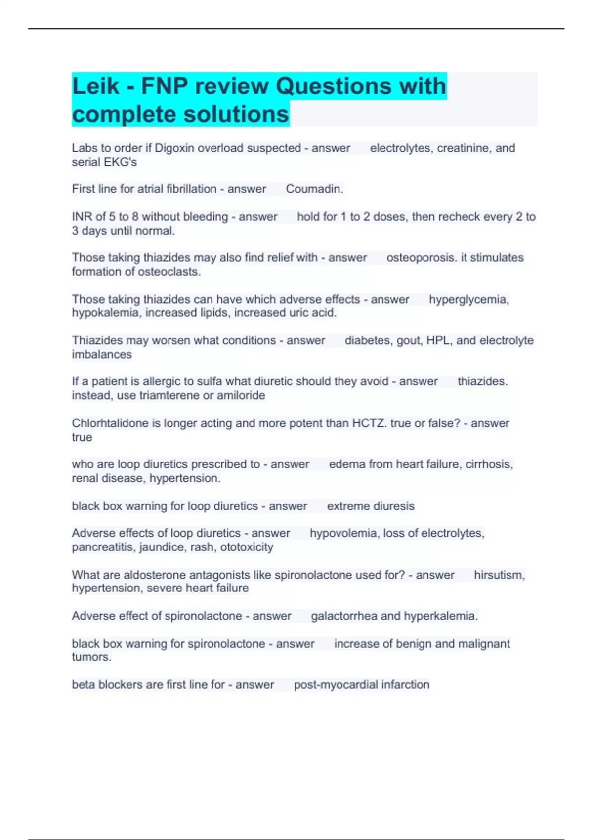 Leik - FNP review Questions with complete solutions Labs to order if Digoxin overload suspected electrolytes, creatinine, and serial EKG's First line for atrial fibrillation Coumadin. INR of 5 to 8 without bleeding hold for 1 to 2 doses, then recheck every 2 to 3 days until normal. Those taking thiazides may also find relief with osteoporosis. it stimulates formation of osteoclasts. Those taking thiazides can have which adverse effects hyperglycemia, hypokalemia, increased lipids, increased uric acid. Thiazides may worsen what conditions diabetes, gout, HPL, and electrolyte imbalances If a patient is allergic to sulfa what diuretic should they avoid thiazides. instead, use triamterene or amiloride Chlorhtalidone is longer acting and more potent than HCTZ. true or false? true who are loop diuretics prescribed to edema from heart failure, cirrhosis, renal disease, hypertension. black box warning for loop diuretics extreme diuresis Adverse effects of loop diuretics hypovolemia, loss of electrolytes, pancreatitis, jaundice, rash, ototoxicity What are aldosterone antagonists like spironolactone used for? hirsutism, hypertension, severe heart failure Adverse effect of spironolactone galactorrhea and hyperkalemia. black box warning for spironolactone increase of benign and malignant tumors. beta blockers are first line for post-myocardial infarction beta blockers are used for migraine prophylaxis, angina, arrythmias, hyperthyroidism cardioselective beta blockers include atenolol and metropolol beta blockres may cause what complication in diabetics they mask the hypoglycemic response. what are contraindications of beta blockers asthma, copd, bronchitis, emphysema, bradycardia A patient with an ace develops a cough. What should you do? stop and switch to an ARB for same renal protective effects. what to monitor when giving captopril CBC. it may cause neutropenia, leukopenia, and agranulocytosis the prescriber should be careful not to mix the calcium channel blocker verapamil with what antibiotics erythromycin and clarithromycin. Contraindications of giving calcium channel blockers av block, bradycardia, congestive heart failure grapefruit juice when taken with calcium channel blockers can cause toxicity. true or false? true drug interactions with calcium channel blockers intraconazole, macrolides when are alpha blockers given hypertension with co-existing BPH terazosin dosing 1 mg PO at bedtime a good alternative for gram positive infections in those who are penicillin allergic is macrolides. Clindamycin is associated with what infection C. diff Initial treatment of COPD antichollinergics. ipratropium bromide what antibiotics are pregnancy category D doxycycline, minocycline, tetracycline tetracyclines will not impact effectiveness of birth control pills. true or false? false 1st line for chlamydial infections and atypical bacteria doxycyline common side effect of minocycline dizziness and vertigo taking expired tetracycline may result in what medical conditions nephropathy and fanconni syndrome Macrolides are generally category B which macrolide are pregnancy category C clarithromycin and telithromycin Those with myasthenia gravis should not take which antibiotic? erythromycin and telithromycin. telithromycin has a black box warning