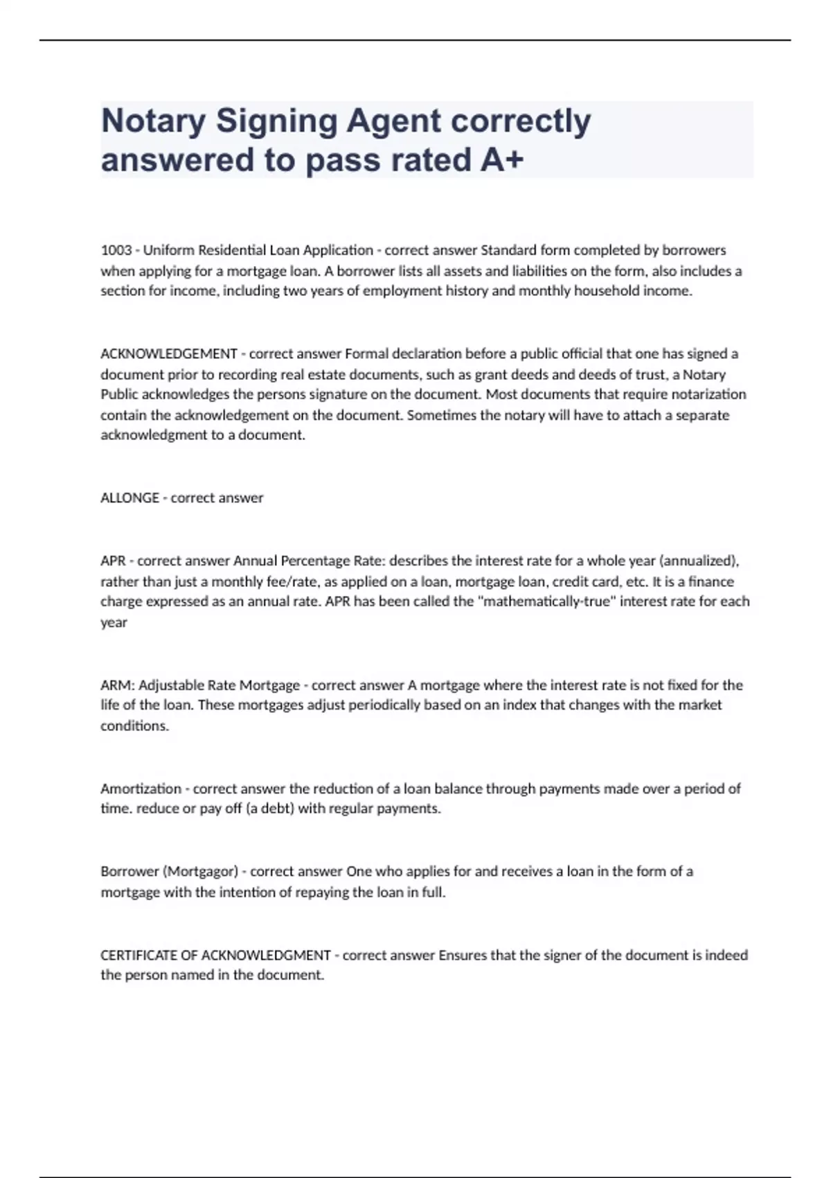 Notary Signing Agent correctly answered to pass rated A+1003 - Uniform Residential Loan Application - correct answer Standard form completed by borrowers when applying for a mortgage loan. A borrower lists all assets and liabilities on the form, also includes a section for income, including two years of employment history and monthly household income. ACKNOWLEDGEMENT - correct answer Formal declaration before a public official that one has signed a document prior to recording real estate documents, such as grant deeds and deeds of trust, a Notary Public acknowledges the persons signature on the document. Most documents that require notarization contain the acknowledgement on the document. Sometimes the notary will have to attach a separate acknowledgment to a document. ALLONGE - correct answer APR - correct answer Annual Percentage Rate: describes the interest rate for a whole year (annualized), rather than just a monthly fee/rate, as applied on a loan, mortgage loan, credit card, etc. It is a finance charge expressed as an annual rate. APR has been called the "mathematically-true" interest rate for each year ARM: Adjustable Rate Mortgage - correct answer A mortgage where the interest rate is not fixed for the life of the loan. These mortgages adjust periodically based on an index that changes with the market conditions. Amortization - correct answer the reduction of a loan balance through payments made over a period of time. reduce or pay off (a debt) with regular payments. Borrower (Mortgagor) - correct answer One who applies for and receives a loan in the form of a mortgage with the intention of repaying the loan in full. CERTIFICATE OF ACKNOWLEDGMENT - correct answer Ensures that the signer of the document is indeed the person named in the document.