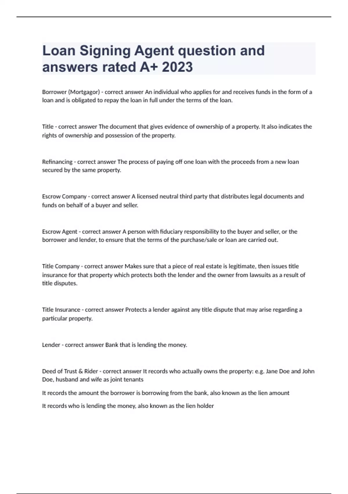Loan Signing Agent question and answers rated A+ 2023Borrower (Mortgagor) - correct answer An individual who applies for and receives funds in the form of a loan and is obligated to repay the loan in full under the terms of the loan. Title - correct answer The document that gives evidence of ownership of a property. It also indicates the rights of ownership and possession of the property. Refinancing - correct answer The process of paying off one loan with the proceeds from a new loan secured by the same property. Escrow Company - correct answer A licensed neutral third party that distributes legal documents and funds on behalf of a buyer and seller. Escrow Agent - correct answer A person with fiduciary responsibility to the buyer and seller, or the borrower and lender, to ensure that the terms of the purchase/sale or loan are carried out. Title Company - correct answer Makes sure that a piece of real estate is legitimate, then issues title insurance for that property which protects both the lender and the owner from lawsuits as a result of title disputes. Title Insurance - correct answer Protects a lender against any title dispute that may arise regarding a particular property. Lender - correct answer Bank that is lending the money. Deed of Trust & Rider - correct answer It records who actually owns the property: e.g. Jane Doe and John Doe, husband and wife as joint tenants It records the amount the borrower is borrowing from the bank, also known as the lien amount It records who is lending the money, also known as the lien holder