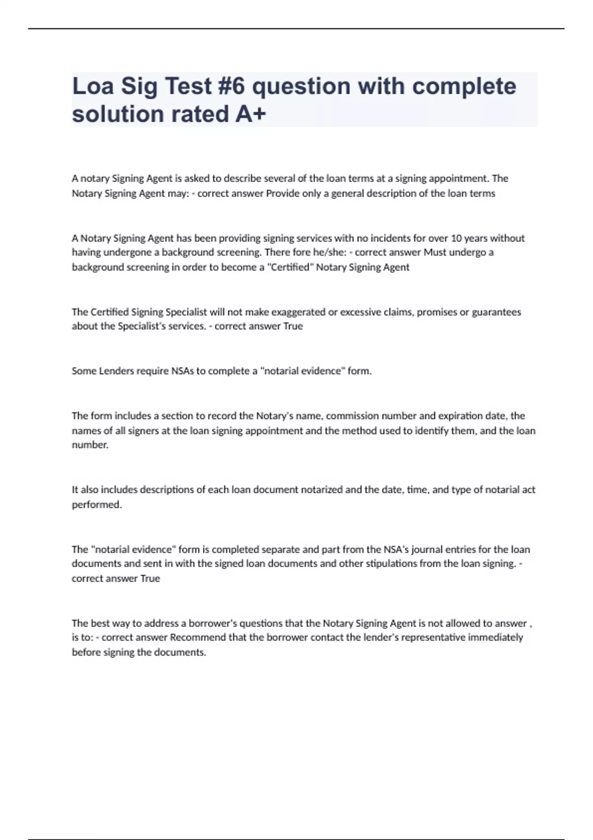 Loa Sig Test #6 question with complete solution rated A+ A notary Signing Agent is asked to describe several of the loan terms at a signing appointment. The Notary Signing Agent may: - correct answer Provide only a general description of the loan terms A Notary Signing Agent has been providing signing services with no incidents for over 10 years without having undergone a background screening. There fore he/she: - correct answer Must undergo a background screening in order to become a "Certified" Notary Signing Agent The Certified Signing Specialist will not make exaggerated or excessive claims, promises or guarantees about the Specialist's services. - correct answer True Some Lenders require NSAs to complete a "notarial evidence" form. The form includes a section to record the Notary's name, commission number and expiration date, the names of all signers at the loan signing appointment and the method used to identify them, and the loan number. It also includes descriptions of each loan document notarized and the date, time, and type of notarial act performed. The "notarial evidence" form is completed separate and part from the NSA's journal entries for the loan documents and sent in with the signed loan documents and other stipulations from the loan signing. - correct answer True The best way to address a borrower's questions that the Notary Signing Agent is not allowed to answer , is to: - correct answer Recommend that the borrower contact the lender's representative immediately before signing the documents.