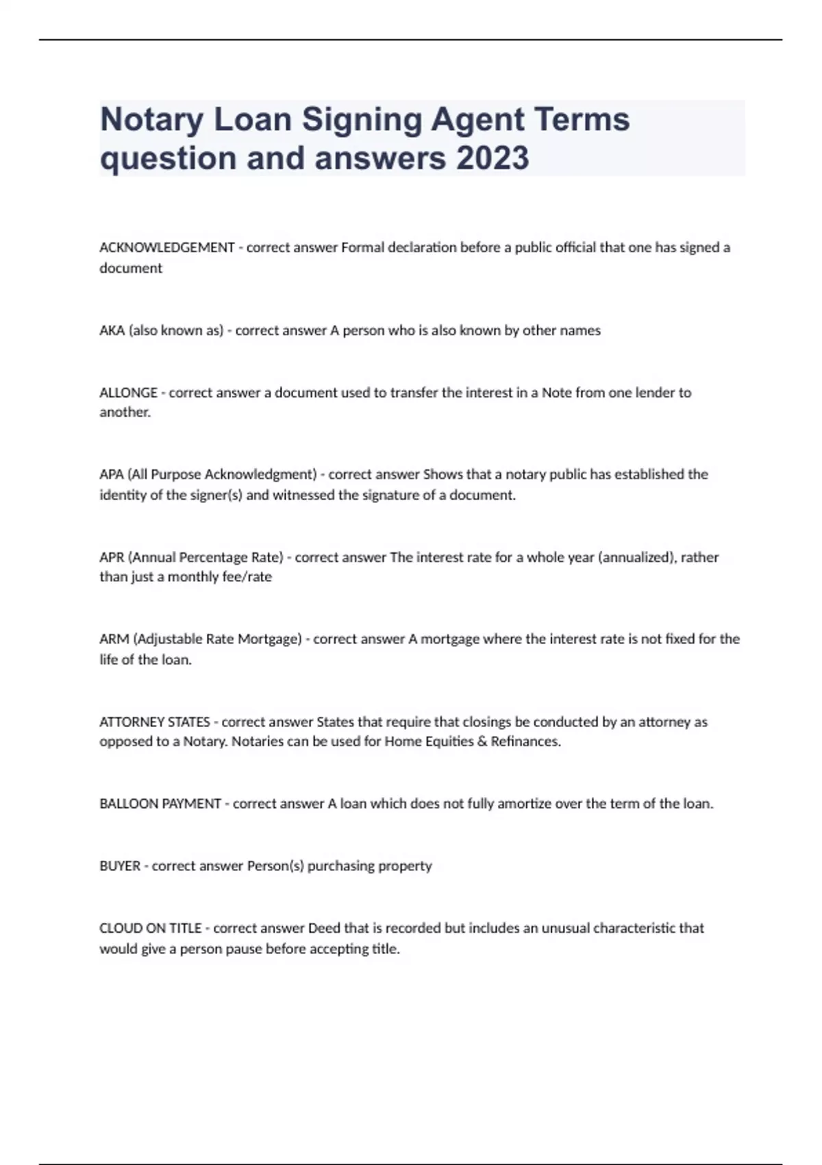 Notary Loan Signing Agent Terms question and answers 2023 ACKNOWLEDGEMENT - correct answer Formal declaration before a public official that one has signed a document AKA (also known as) - correct answer A person who is also known by other names ALLONGE - correct answer a document used to transfer the interest in a Note from one lender to another. APA (All Purpose Acknowledgment) - correct answer Shows that a notary public has established the identity of the signer(s) and witnessed the signature of a document. APR (Annual Percentage Rate) - correct answer The interest rate for a whole year (annualized), rather than just a monthly fee/rate ARM (Adjustable Rate Mortgage) - correct answer A mortgage where the interest rate is not fixed for the life of the loan. ATTORNEY STATES - correct answer States that require that closings be conducted by an attorney as opposed to a Notary. Notaries can be used for Home Equities & Refinances. BALLOON PAYMENT - correct answer A loan which does not fully amortize over the term of the loan. BUYER - correct answer Person(s) purchasing property CLOUD ON TITLE - correct answer Deed that is recorded but includes an unusual characteristic that would give a person pause before accepting title.