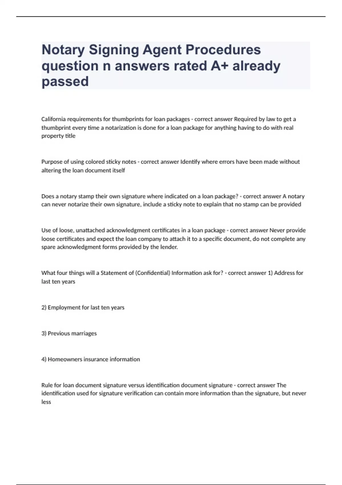 Notary Signing Agent Procedures question n answers rated A+ already passedCalifornia requirements for thumbprints for loan packages - correct answer Required by law to get a thumbprint every time a notarization is done for a loan package for anything having to do with real property title Purpose of using colored sticky notes - correct answer Identify where errors have been made without altering the loan document itself Does a notary stamp their own signature where indicated on a loan package? - correct answer A notary can never notarize their own signature, include a sticky note to explain that no stamp can be provided Use of loose, unattached acknowledgment certificates in a loan package - correct answer Never provide loose certificates and expect the loan company to attach it to a specific document, do not complete any spare acknowledgment forms provided by the lender. What four things will a Statement of (Confidential) Information ask for? - correct answer 1) Address for last ten years 2) Employment for last ten years 3) Previous marriages 4) Homeowners insurance information Rule for loan document signature versus identification document signature - correct answer The identification used for signature verification can contain more information than the signature, but never less