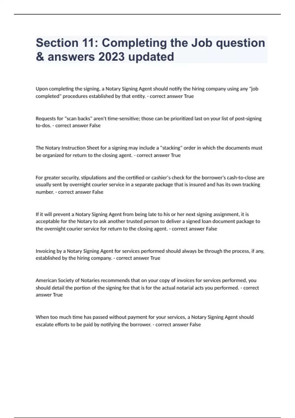 Section 11: Completing the Job question & answers 2023 updated Upon completing the signing, a Notary Signing Agent should notify the hiring company using any "job completed" procedures established by that entity. - correct answer True Requests for "scan backs" aren't time-sensitive; those can be prioritized last on your list of post-signing to-dos. - correct answer False The Notary Instruction Sheet for a signing may include a "stacking" order in which the documents must be organized for return to the closing agent. - correct answer True For greater security, stipulations and the certified or cashier's check for the borrower's cash-to-close are usually sent by overnight courier service in a separate package that is insured and has its own tracking number. - correct answer False If it will prevent a Notary Signing Agent from being late to his or her next signing assignment, it is acceptable for the Notary to ask another trusted person to deliver a signed loan document package to the overnight courier service for return to the closing agent. - correct answer False Invoicing by a Notary Signing Agent for services performed should always be through the process, if any, established by the hiring company. - correct answer True American Society of Notaries recommends that on your copy of invoices for services performed, you should detail the portion of the signing fee that is for the actual notarial acts you performed. - correct answer True When too much time has passed without payment for your services, a Notary Signing Agent should escalate efforts to be paid by notifying the borrower. - correct answer False