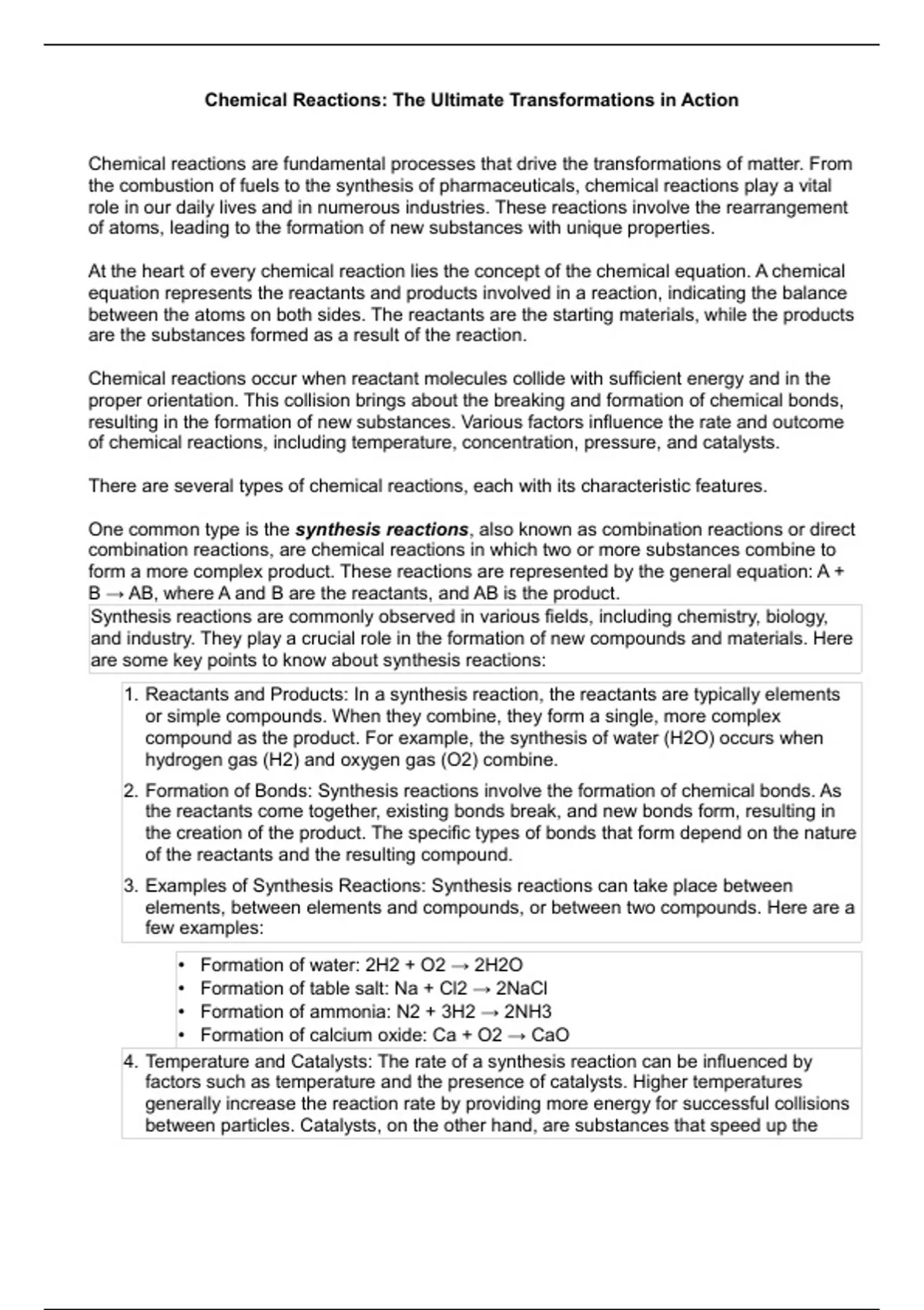 "Chemical Reactions: The Ultimate Transformations in Action" is an enlightening document that explores the captivating world of chemical reactions. This concise guide provides an overview of various reaction types, from redox and acid-base reactions to combustion and stoichiometry. Readers will learn about reactants, products, and the vital process of balancing chemical equations. The document also delves into crucial concepts such as exothermic and endothermic reactions, catalysts, and reaction rates, shedding light on the factors that influence the speed and efficiency of transformations. With insights into energy changes, oxidation-reduction reactions, and the law of conservation of mass, this document serves as an invaluable resource for understanding the fundamental principles and mechanisms behind chemical reactions.
