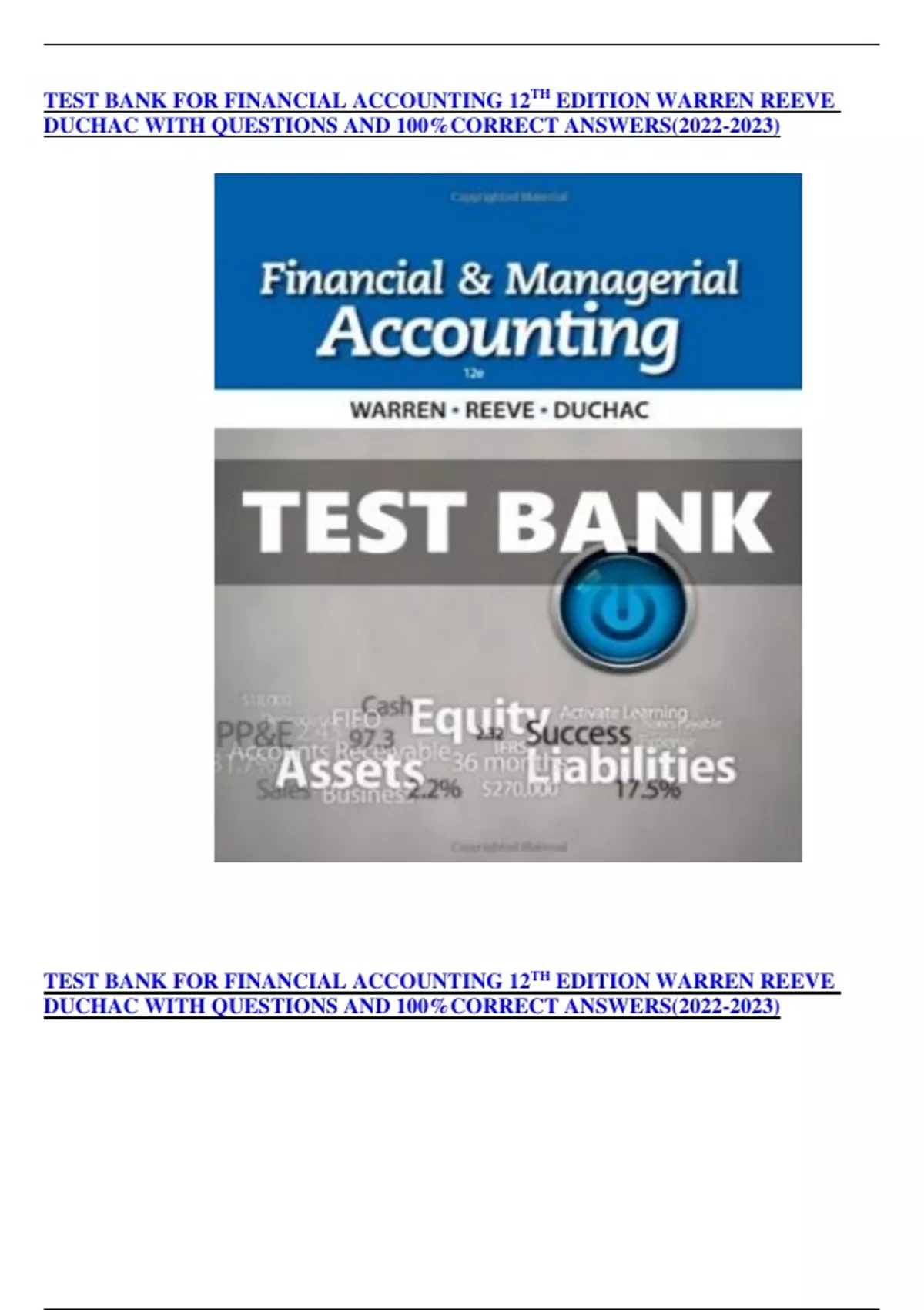 TEST BANK FOR FINANCIAL ACCOUNTING 12TH EDITION WARREN REEVE DUCHAC WITH QUESTIONS AND 100%CORRECT ANSWERS()