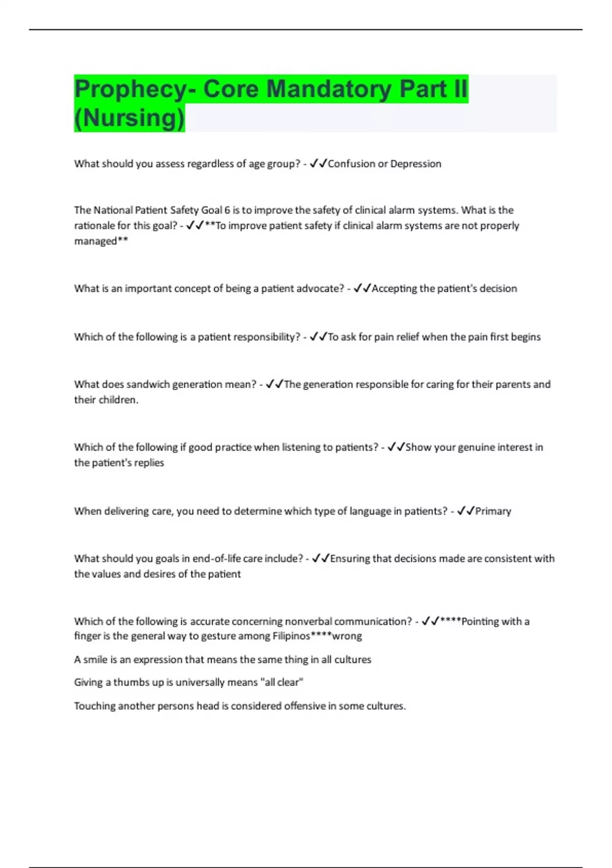 What should you assess regardless of age group? - Confusion or Depression The National Patient Safety Goal 6 is to improve the safety of clinical alarm systems. What is the rationale for this goal? - **To improve patient safety if clinical alarm systems are not properly managed** What is an important concept of being a patient advocate? - Accepting the patient's decision Which of the following is a patient responsibility? - To ask for pain relief when the pain first begins What does sandwich generation mean? - The generation responsible for caring for their parents and their children. Which of the following if good practice when listening to patients? - Show your genuine interest in the patient's replies When delivering care, you need to determine which type of language in patients? - Primary What should you goals in end-of-life care include? - Ensuring that decisions made are consistent with the values and desires of the patient Which of the following is accurate concerning nonverbal communication? - ****Pointing with a finger is the general way to gesture among Filipinos****wrong A smile is an expression that means the same thing in all cultures Giving a thumbs up is universally means "all clear" Touching another persons head is considered offensive in some cultures.