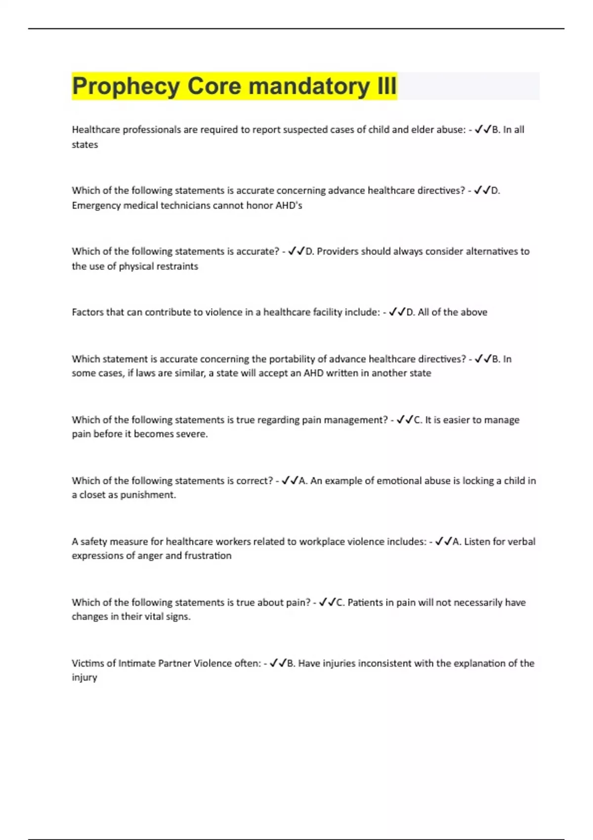 Healthcare professionals are required to report suspected cases of child and elder abuse: - B. In all states Which of the following statements is accurate concerning advance healthcare directives? - D. Emergency medical technicians cannot honor AHD's Which of the following statements is accurate? - D. Providers should always consider alternatives to the use of physical restraints Factors that can contribute to violence in a healthcare facility include: - D. All of the above Which statement is accurate concerning the portability of advance healthcare directives? - B. In some cases, if laws are similar, a state will accept an AHD written in another state Which of the following statements is true regarding pain management? - C. It is easier to manage pain before it becomes severe. Which of the following statements is correct? - A. An example of emotional abuse is locking a child in a closet as punishment. A safety measure for healthcare workers related to workplace violence includes: - A. Listen for verbal expressions of anger and frustration Which of the following statements is true about pain? - C. Patients in pain will not necessarily have changes in their vital signs. Victims of Intimate Partner Violence often: - B. Have injuries inconsistent with the explanation of the injury