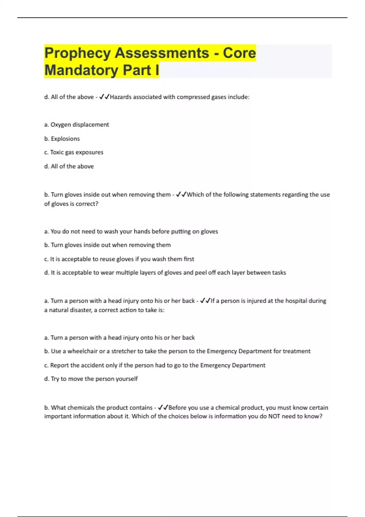 d. All of the above - Hazards associated with compressed gases include: a. Oxygen displacement b. Explosions c. Toxic gas exposures d. All of the above b. Turn gloves inside out when removing them - Which of the following statements regarding the use of gloves is correct? a. You do not need to wash your hands before putting on gloves b. Turn gloves inside out when removing them c. It is acceptable to reuse gloves if you wash them first d. It is acceptable to wear multiple layers of gloves and peel off each layer between tasks a. Turn a person with a head injury onto his or her back - If a person is injured at the hospital during a natural disaster, a correct action to take is: a. Turn a person with a head injury onto his or her back b. Use a wheelchair or a stretcher to take the person to the Emergency Department for treatment c. Report the accident only if the person had to go to the Emergency Department d. Try to move the person yourself b. What chemicals the product contains - Before you use a chemical product, you must know certain important information about it. Which of the choices below is information you do NOT need to know?