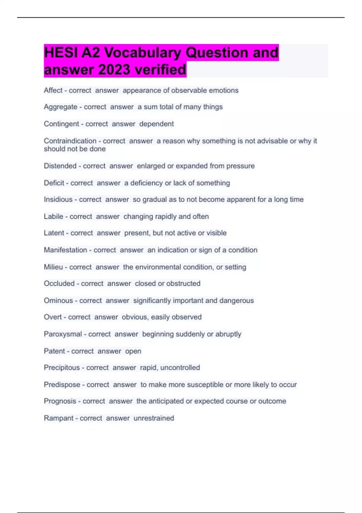 HESI A2 Vocabulary Question and answer 2023 verified Affect appearance of observable emotions Aggregate a sum total of many things Contingent dependent Contraindication a reason why something is not advisable or why it should not be done Distended enlarged or expanded from pressure Deficit a deficiency or lack of something Insidious so gradual as to not become apparent for a long time Labile changing rapidly and often Latent present, but not active or visible Manifestation an indication or sign of a condition Milieu the environmental condition, or setting Occluded closed or obstructed Ominous significantly important and dangerous Overt obvious, easily observed Paroxysmal beginning suddenly or abruptly Patent open Precipitous rapid, uncontrolled Predispose to make more susceptible or more likely to occur