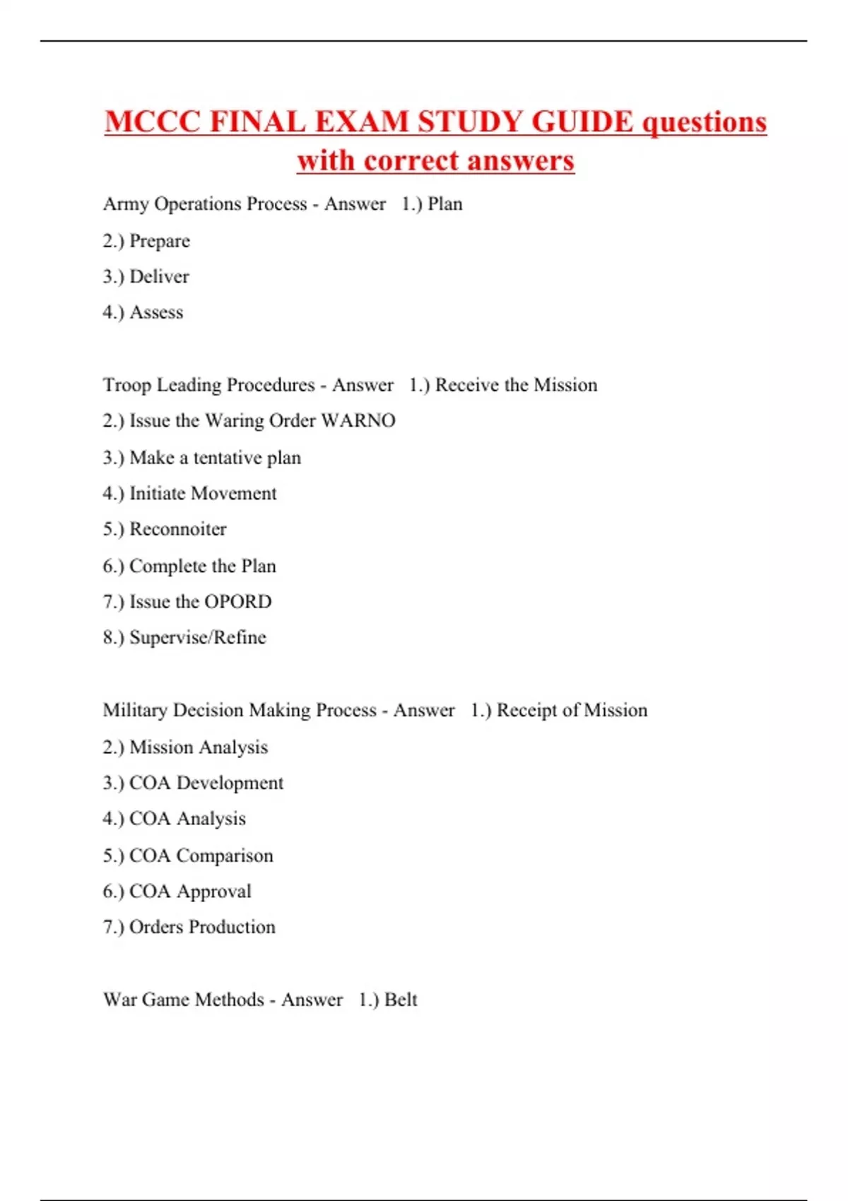 Army Operations Process - Answer 1.) Plan 2.) Prepare 3.) Deliver 4.) Assess Troop Leading Procedures - Answer 1.) Receive the Mission 2.) Issue the Waring Order WARNO 3.) Make a tentative plan 4.) Initiate Movement 5.) Reconnoiter 6.) Complete the Plan 7.) Issue the OPORD 8.) Supervise/Refine Military Decision Making Process - Answer 1.) Receipt of Mission 2.) Mission Analysis 3.) COA Development 4.) COA Analysis 5.) COA Comparison 6.) COA Approval 7.) Orders Production War Game Methods - Answer 1.) Belt