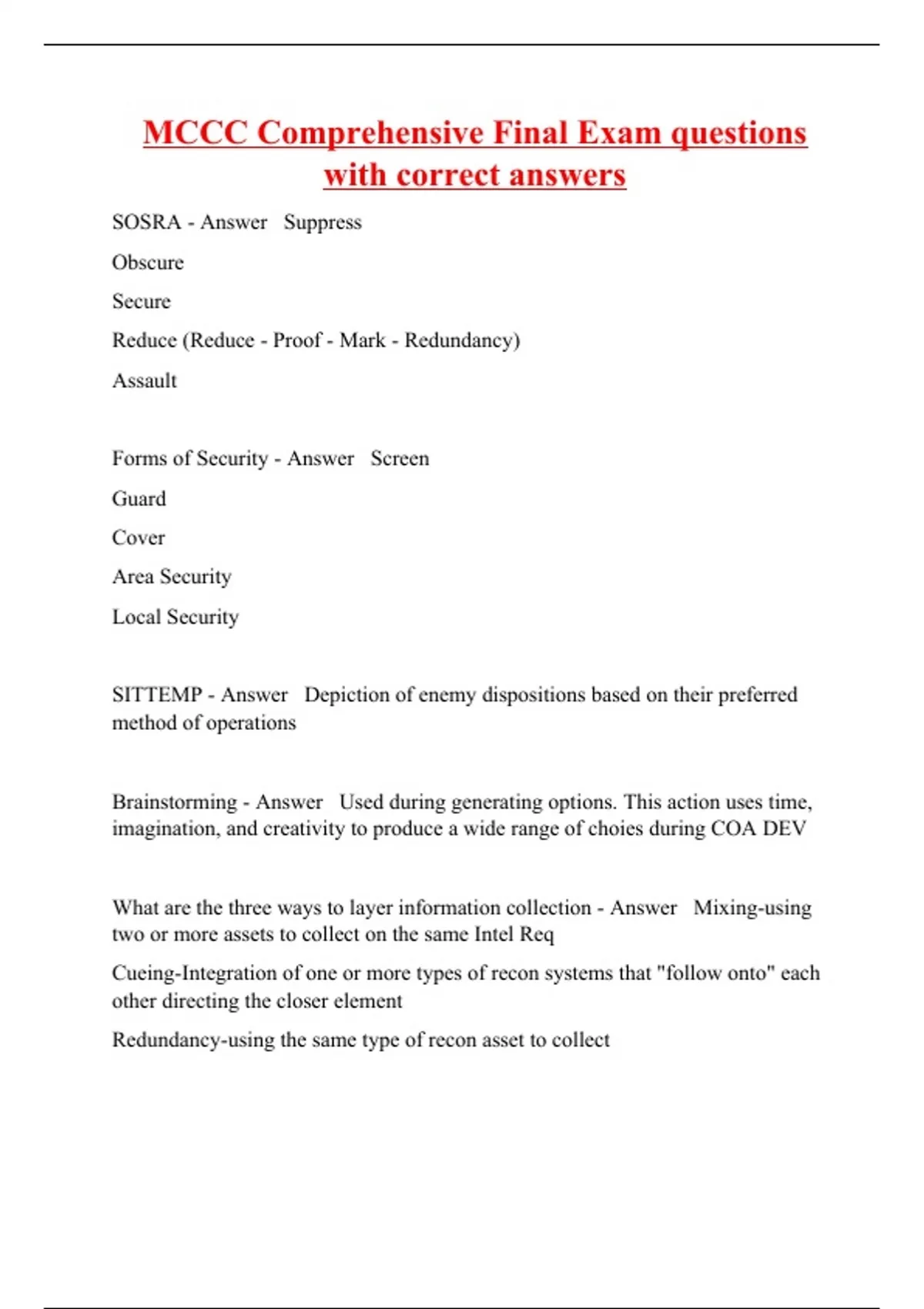 SOSRA - Answer Suppress Obscure Secure Reduce (Reduce - Proof - Mark - Redundancy) Assault Forms of Security - Answer Screen Guard Cover Area Security Local Security SITTEMP - Answer Depiction of enemy dispositions based on their preferred method of operations Brainstorming - Answer Used during generating options. This action uses time, imagination, and creativity to produce a wide range of choies during COA DEV What are the three ways to layer information collection - Answer Mixing-using two or more assets to collect on the same Intel Req Cueing-Integration of one or more types of recon systems that "follow onto" each other directing the closer element Redundancy-using the same type of recon asset to collect Military Aspects of Terrain - Answer Obstacles
