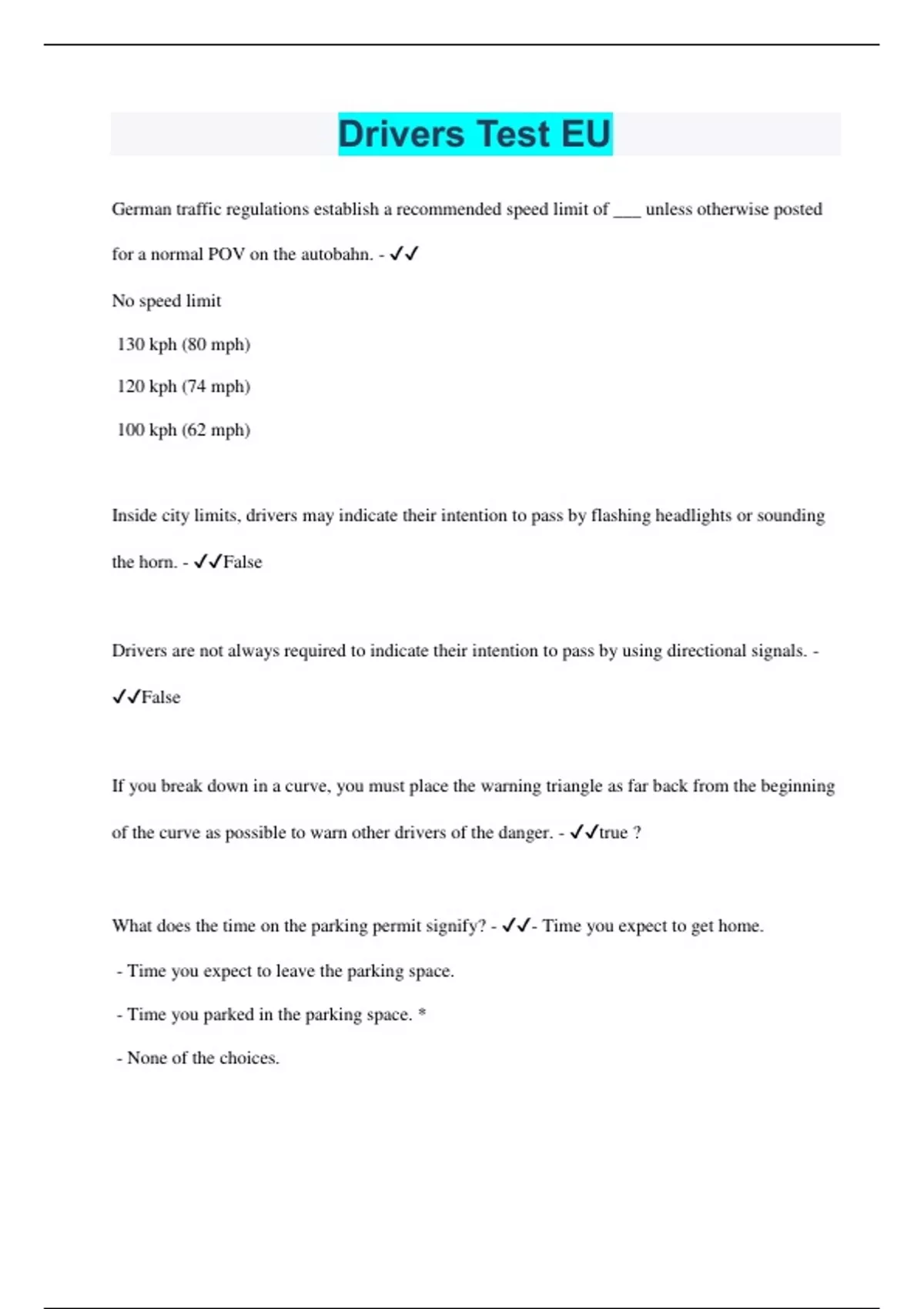 German traffic regulations establish a recommended speed limit of ___ unless otherwise posted for a normal POV on the autobahn. - No speed limit 130 kph (80 mph) 120 kph (74 mph) 100 kph (62 mph) Inside city limits, drivers may indicate their intention to pass by flashing headlights or sounding the horn. - False Drivers are not always required to indicate their intention to pass by using directional signals. - False If you break down in a curve, you must place the warning triangle as far back from the beginning of the curve as possible to warn other drivers of the danger. - true ? What does the time on the parking permit signify? - - Time you expect to get home. - Time you expect to leave the parking space. - Time you parked in the parking space. * - None of the choices.