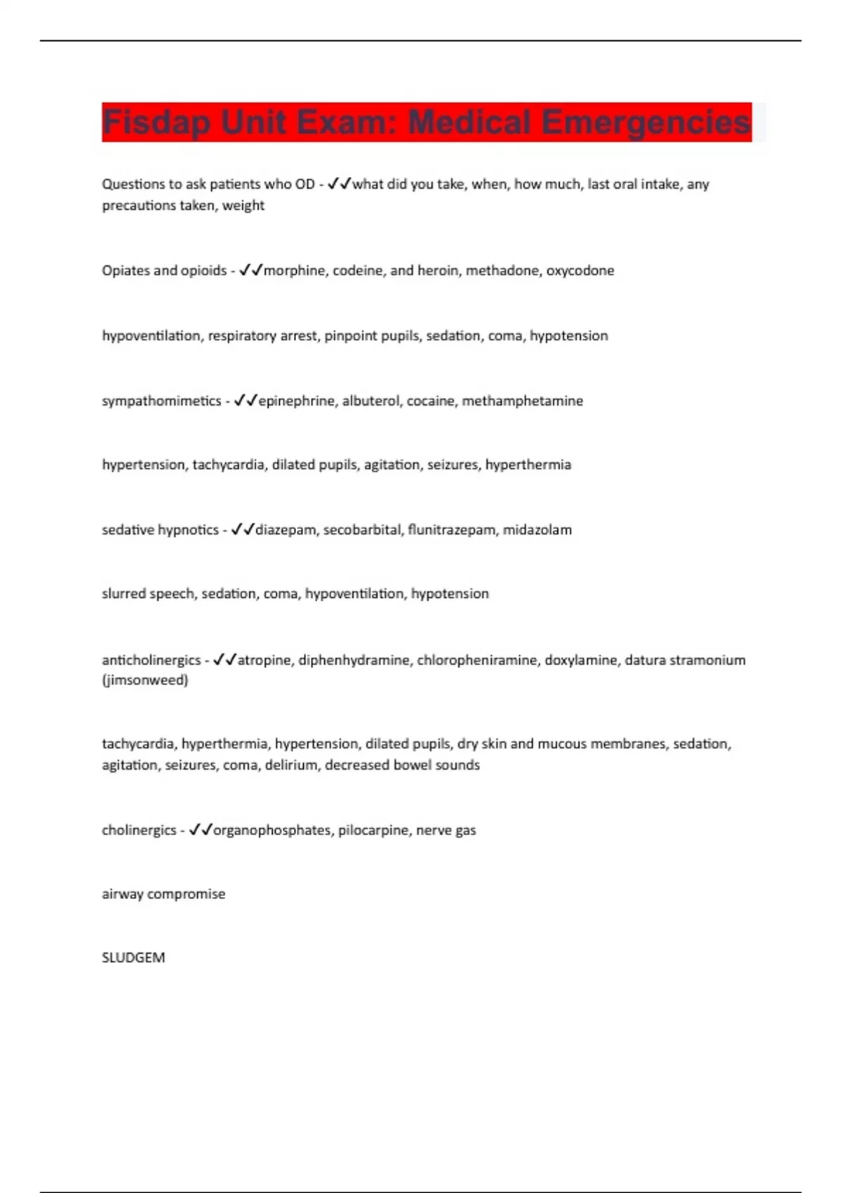 Questions to ask patients who OD - what did you take, when, how much, last oral intake, any precautions taken, weight Opiates and opioids - morphine, codeine, and heroin, methadone, oxycodone hypoventilation, respiratory arrest, pinpoint pupils, sedation, coma, hypotension sympathomimetics - epinephrine, albuterol, cocaine, methamphetamine hypertension, tachycardia, dilated pupils, agitation, seizures, hyperthermia sedative hypnotics - diazepam, secobarbital, flunitrazepam, midazolam slurred speech, sedation, coma, hypoventilation, hypotension anticholinergics - atropine, diphenhydramine, chloropheniramine, doxylamine, datura stramonium (jimsonweed) tachycardia, hyperthermia, hypertension, dilated pupils, dry skin and mucous membranes, sedation, agitation, seizures, coma, delirium, decreased bowel sounds cholinergics - organophosphates, pilocarpine, nerve gas airway compromise SLUDGEM