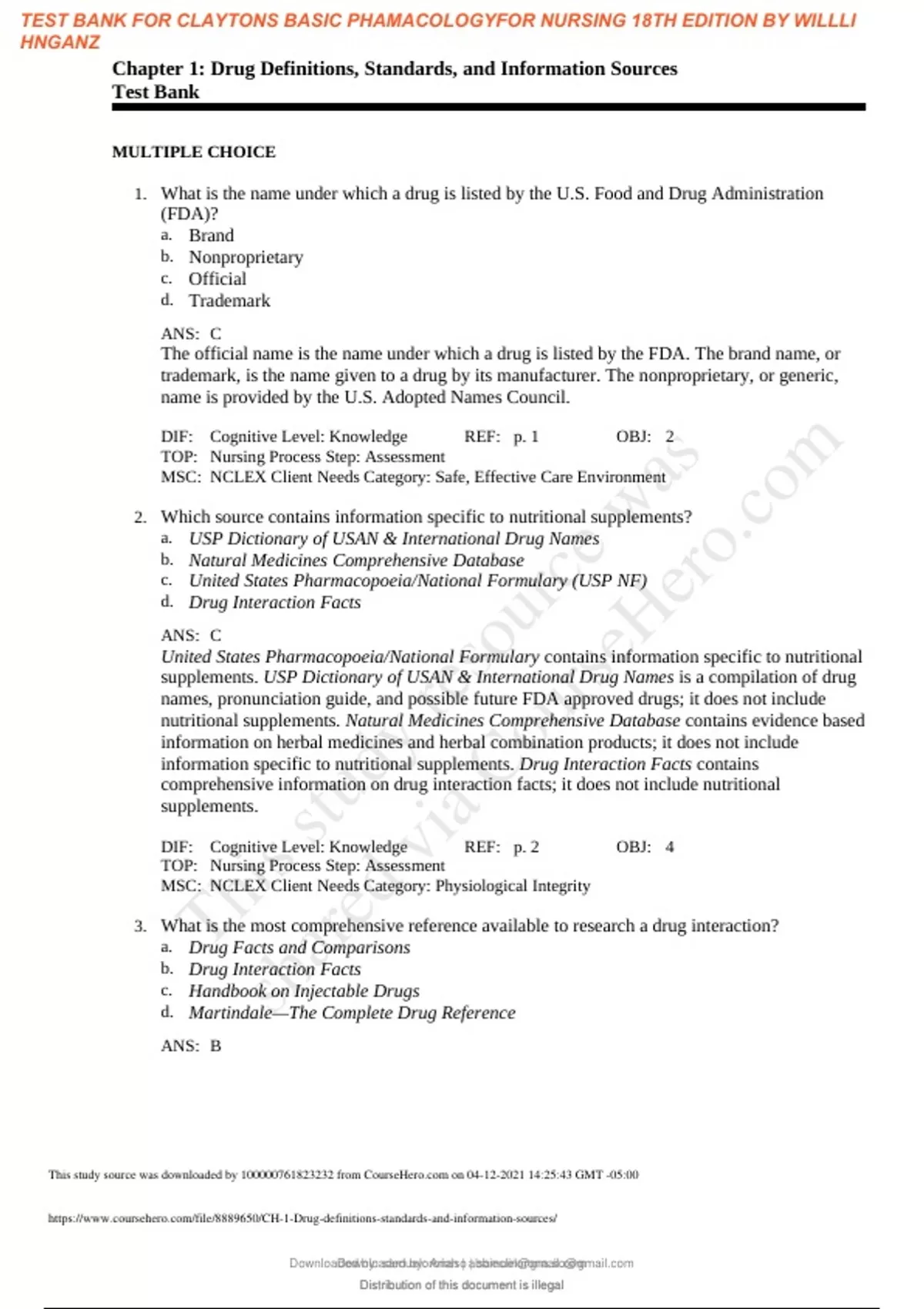 Test bank for claytons basic pharmacology for nurses 18th edition by willihnganz