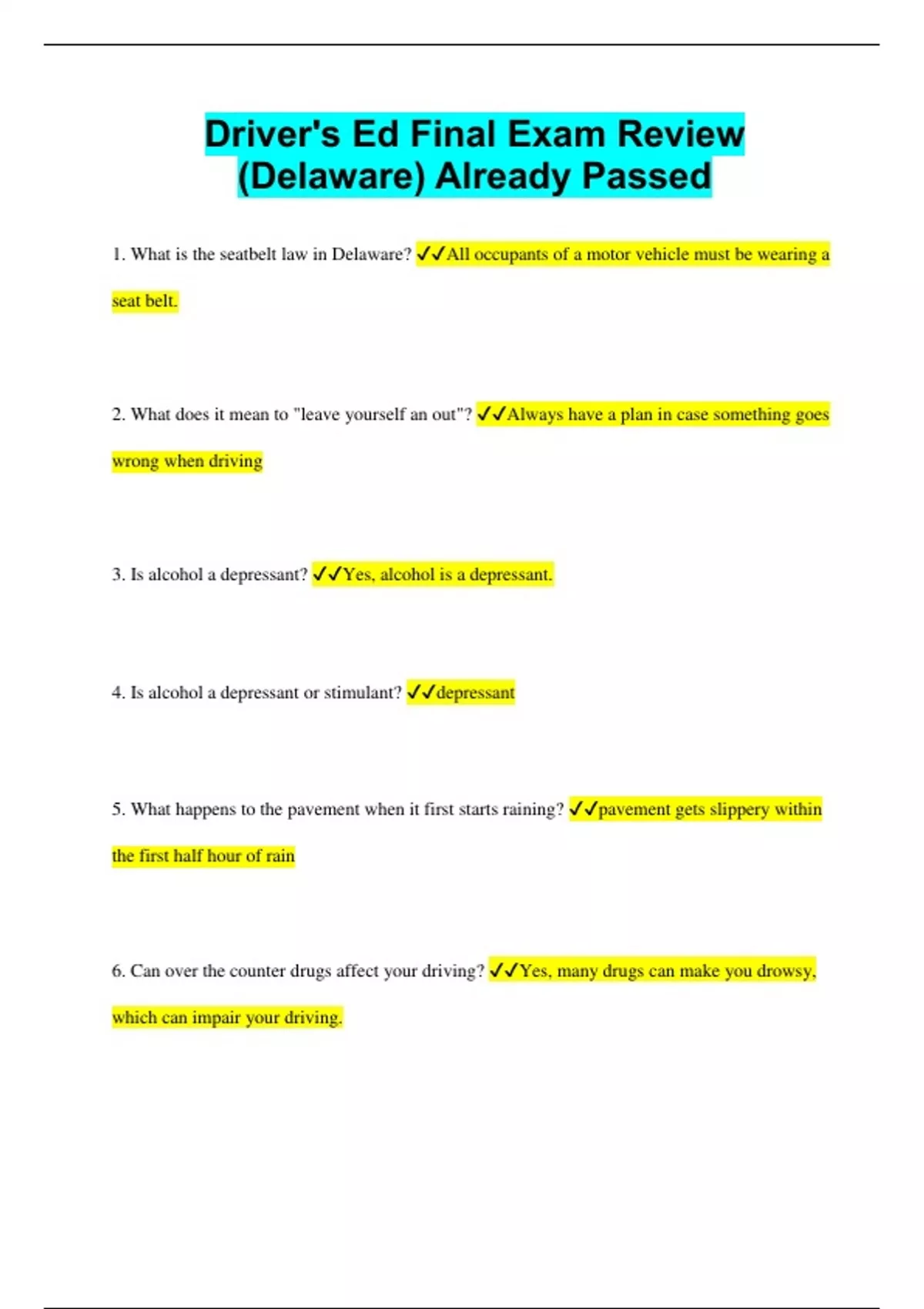 Driver's Ed Final Exam Review (Delaware) Already Passed 1. What is the seatbelt law in Delaware? All occupants of a motor vehicle must be wearing a seat belt. 2. What does it mean to "leave yourself an out"? Always have a plan in case something goes wrong when driving 3. Is alcohol a depressant? Yes, alcohol is a depressant. 4. Is alcohol a depressant or stimulant? depressant 5. What happens to the pavement when it first starts raining? pavement gets slippery within the first half hour of rain 6. Can over the counter drugs affect your driving? Yes, many drugs can make you drowsy, which can impair your driving. 7. Are there times when you have to adjust your speed due to weather conditions? Yes, in bad weather conditions you need to reduce your speed to avoid an accident or collision. 8. The law for cell phone use for adults and GDL drivers Regular license holders aren't allowed to use their cell phone except for hands free devices. GDL drivers are not allowed to use their cell phone at all, including hands free devices. 9. What do solid yellow lines mean? Passing is not allowed and the traffic is moving in different directions 10. Which way should pedestrians face when there is no available sidewalk? walk on the side where you will be facing oncoming traffic 11. What are the rules for logging practice hours on the first 6 months of your GDL? 50 hours of driving practice, 10 hours is night driving; turned into Dpt. of Education certified by sponsor 12. Right Turns on Red Right turns on red are allowed if not otherwise made illegal by signage 13. Which behaviors will constitute "aggressive driving? failure to yield, unsafe lane changes, disregard of a traffic control device, failure to stop at the command of a police officer, following too closely, passing on the shoulder, and speeding 14. Zero Tolerance Law People under the age of 21 who are driving while consuming or after having consumed alcoholic beverages, shall have his/her driver license revoked for two months for the first offense and not less than six months nor more than twelve months for each subsequent offense 15. What should you do when approached by an emergency vehicle with flashing lights? Pull over to the right if possible, but more importantly, get out of the way 16. At the scene of an accident should you move an injured passenger? No, never move an injured person at an accident unless they are in danger of getting hit by passing cars or they are in a burning car 17. Can wind cause your car to sway on the road? Yes, wind can cause your car to sway so you need to hold onto the steering wheel to prevent swerving. 18. Why do you give motorcycles more room? Motorcycles h