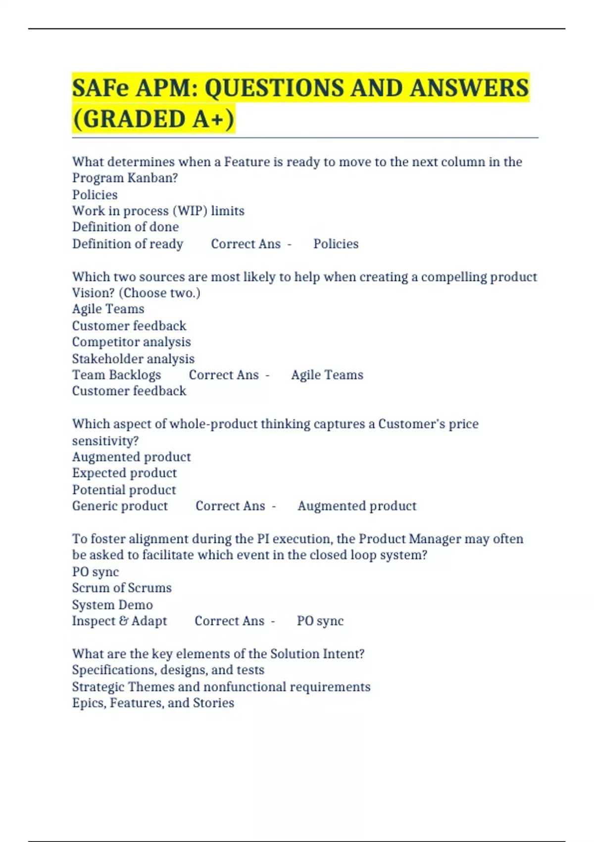 SAFe APM: QUESTIONS AND ANSWERS (GRADED A+)