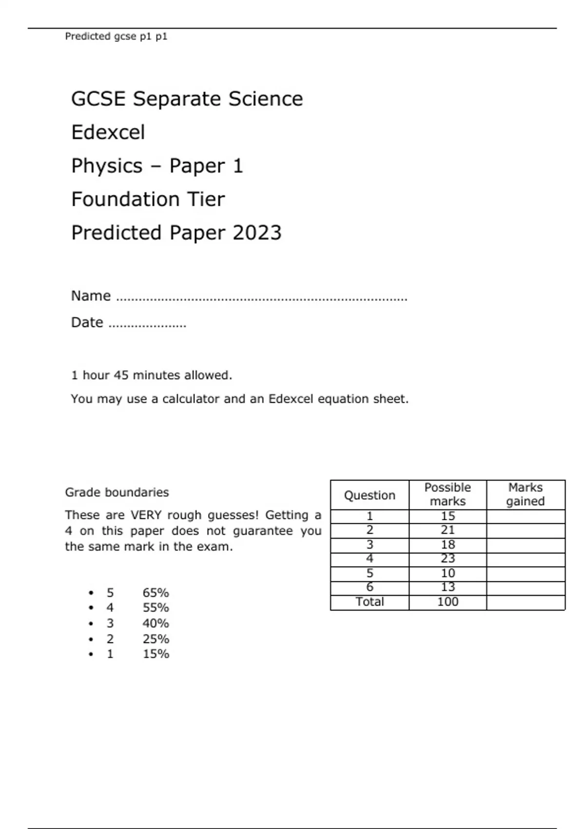 Edexcel GCSE Separate Science Physics Paper 1 Foundation Tier Predicted Paper 2023 Questions and Answers