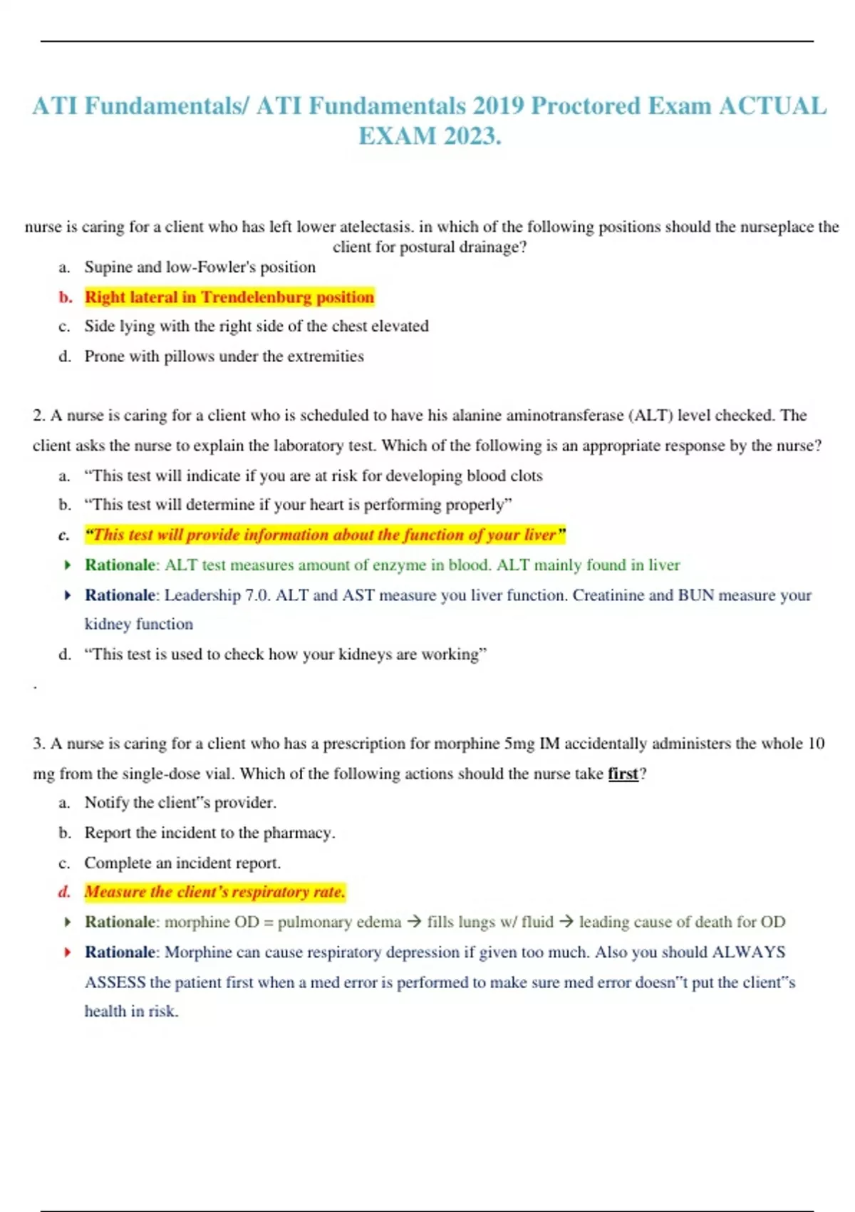 ATI Fundamentals/ ATI Fundamentals 2019 Proctored Exam ACTUAL EXAM 2023. nurse is caring for a client who has left lower atelectasis. in which of the following positions should the nurse place the client for postural drainage? a. Supine and low-Fowler's position b. Right lateral in Trendelenburg position c. Side lying with the right side of the chest elevated d. Prone with pillows under the extremities