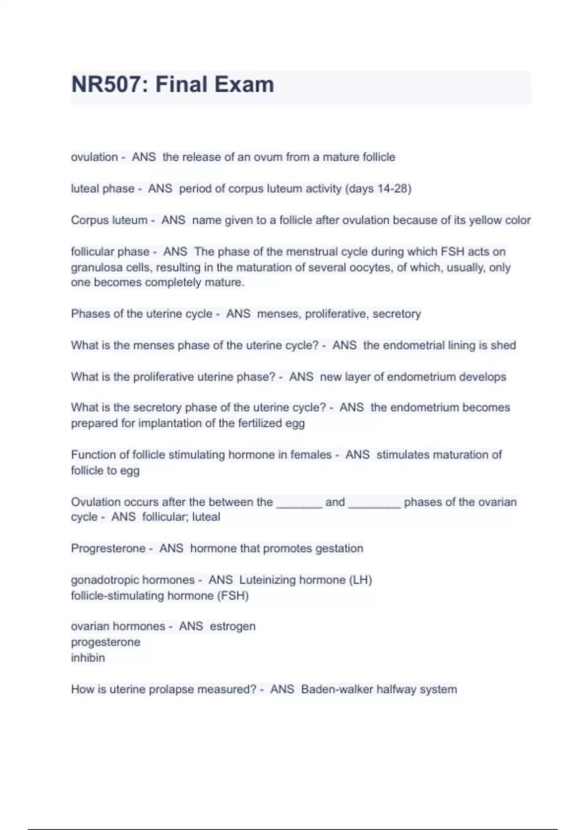 NR507: Final Exam QUESTIONS AND ANSWERS ALL CORRECT ovulation - ANS the release of an ovum from a mature follicle luteal phase - ANS period of corpus luteum activity (days 14-28) Corpus luteum - ANS name given to a follicle after ovulation because of its yellow color follicular phase - ANS The phase of the menstrual cycle during which FSH acts on granulosa cells, resulting in the maturation of several oocytes, of which, usually, only one becomes completely mature. Phases of the uterine cycle - ANS menses, proliferative, secretory What is the menses phase of the uterine cycle? - ANS the endometrial lining is shed What is the proliferative uterine phase? - ANS new layer of endometrium develops What is the secretory phase of the uterine cycle? - ANS the endometrium becomes prepared for implantation of the fertilized egg Function of follicle stimulating hormone in females - ANS stimulates maturation of follicle to egg Ovulation occurs after the between the _______ and ________ phases of the ovarian cycle - ANS follicular; luteal Progresterone - ANS hormone that promotes gestation gonadotropic hormones - ANS Luteinizing hormone (LH) follicle-stimulating hormone (FSH) ovarian hormones - ANS estrogen progesterone inhibin How is uterine prolapse measured? - ANS Baden-walker halfway system Signs of PMDD - ANS extreme mood swings, sadness, hopelessness, anger, breast tenderness, bloating Abnormal uterine bleeding (AUB) definition - ANS bleeding that is abnormal in duration, volume, frequency, or regularity that has been present for the majority of 6 months non -structural causes of AUB - ANS "COEIN" coagulopathy ovulatory dysfunction endometrial iatrogenic not-yet classified Structural causes of AUB - ANS "Palm" polyp adenomyosis leiomyoma malignancy and hyperplasia PCOS the most common cause of ___________ and _________ ____________ - ANS anovulation and ovulatory dysfunction What is PCOS? - ANS Multiple ovarian follicular cysts due to hormone imbalance that can cause infertility Pts with increased risk of Prostate CA - ANS HIV infection undescended testicle family history personal history carcinoma in situ of the testicle