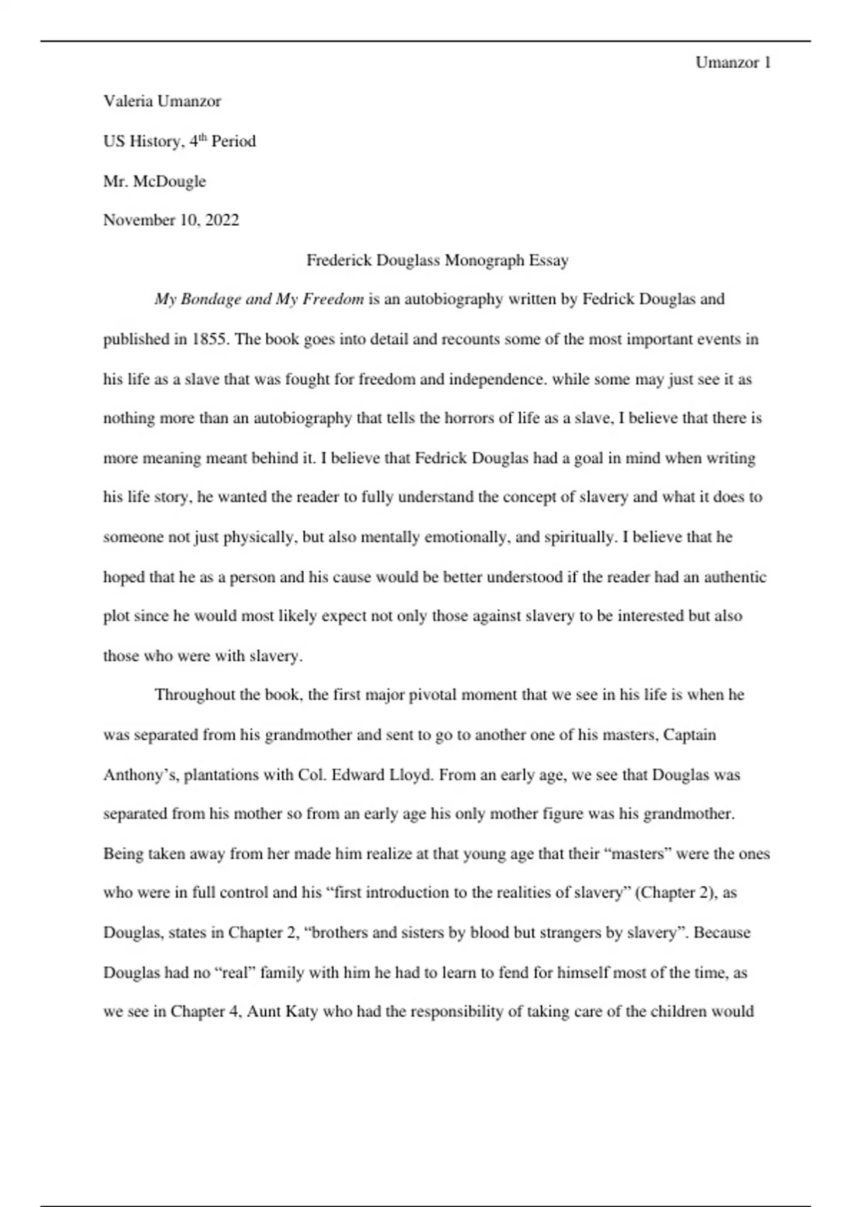 an essay deon based of the book My Bondage and My Freedom by Federick Douglas