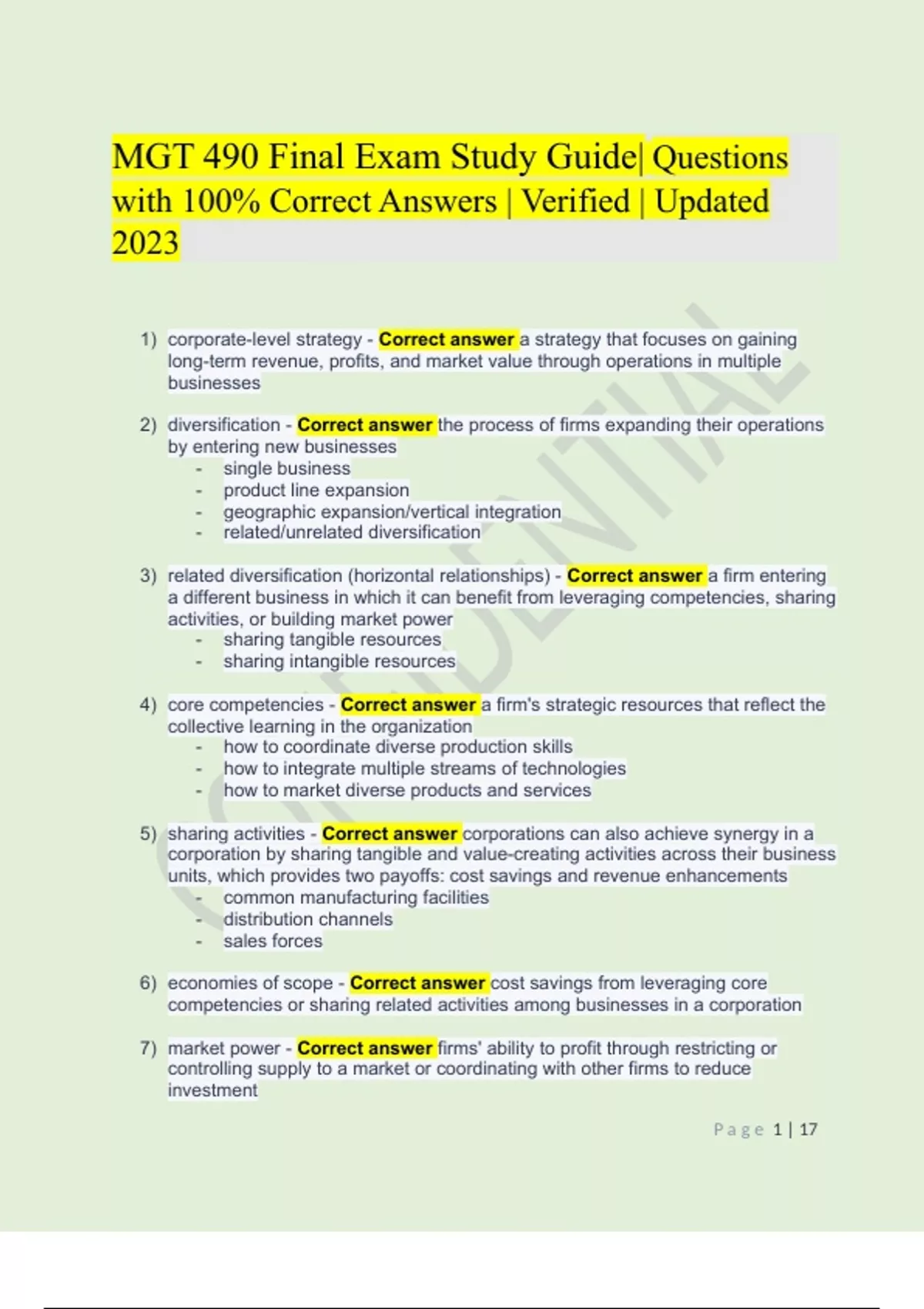 MGT 490 Final Exam Study Guide| Questions with 100% Correct Answers | Verified | Updated 2023