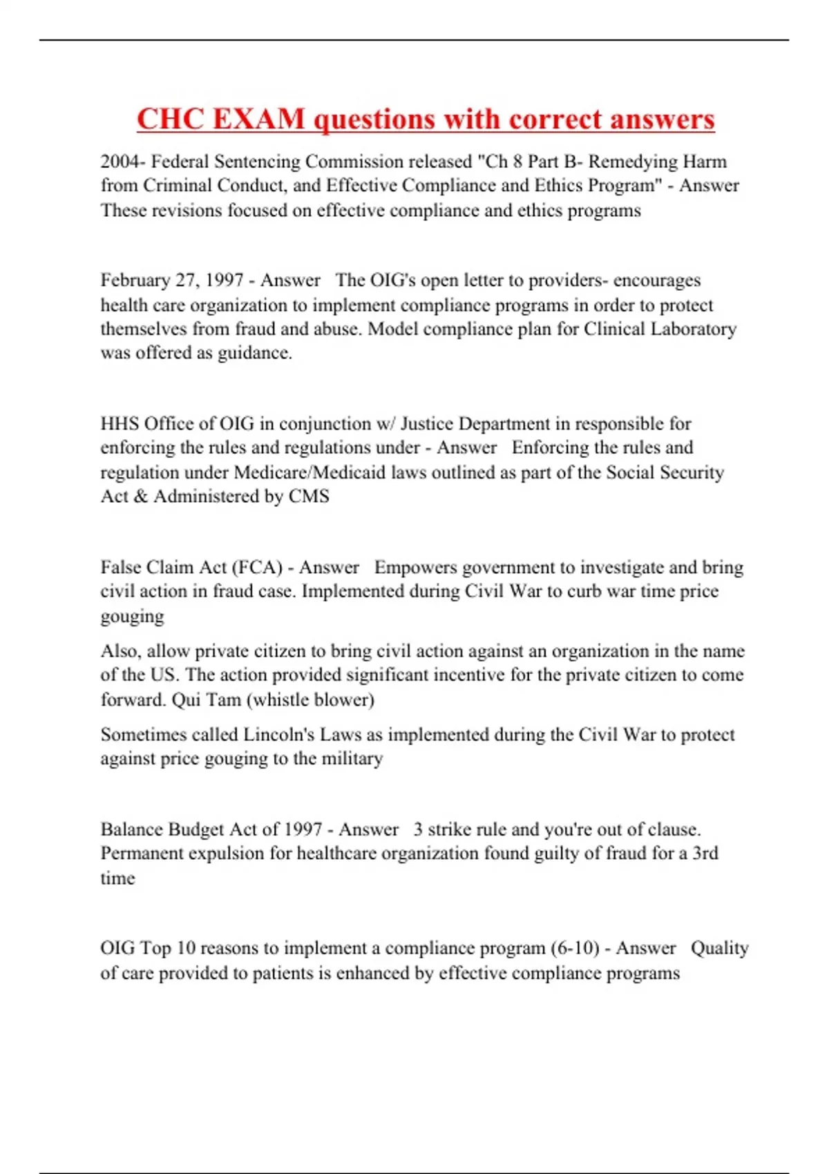 2004- Federal Sentencing Commission released "Ch 8 Part B- Remedying Harm from Criminal Conduct, and Effective Compliance and Ethics Program" - Answer These revisions focused on effective compliance and ethics programs February 27, 1997 - Answer The OIG's open letter to providers- encourages health care organization to implement compliance programs in order to protect themselves from fraud and abuse. Model compliance plan for Clinical Laboratory was offered as guidance. HHS Office of OIG in conjunction w/ Justice Department in responsible for enforcing the rules and regulations under - Answer Enforcing the rules and regulation under Medicare/Medicaid laws outlined as part of the Social Security Act & Administered by CMS False Claim Act (FCA) - Answer Empowers government to investigate and bring civil action in fraud case. Implemented during Civil War to curb war time price gouging Also, allow private citizen to bring civil action against an organization in the name of the US. The action provided significant incentive for the private citizen to come forward. Qui Tam (whistle blower) Sometimes called Lincoln's Laws as implemented during the Civil War to protect against price gouging to the military Balance Budget Act of 1997 - Answer 3 strike rule and you're out of clause. Permanent expulsion for healthcare organization found guilty of fraud for a 3rd time OIG Top 10 reasons to implement a compliance program (6-10) - Answer Quality of care provided to patients is enhanced by effective comp