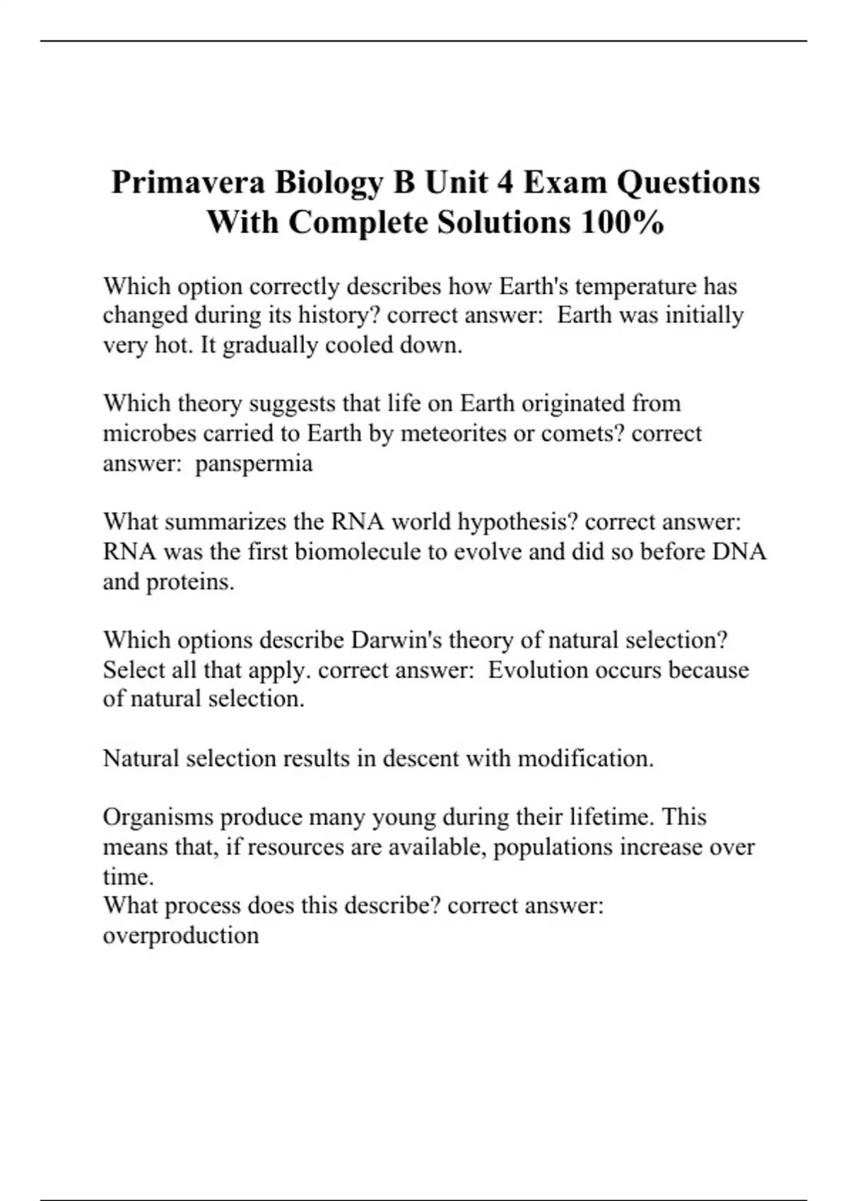Which option correctly describes how Earth's temperature has changed during its history? correct answer: Earth was initially very hot. It gradually cooled down. Which theory suggests that life on Earth originated from microbes carried to Earth by meteorites or comets? correct answer: panspermia What summarizes the RNA world hypothesis? correct answer: RNA was the first biomolecule to evolve and did so before DNA and proteins. Which options describe Darwin's theory of natural selection? Select all that apply. correct a