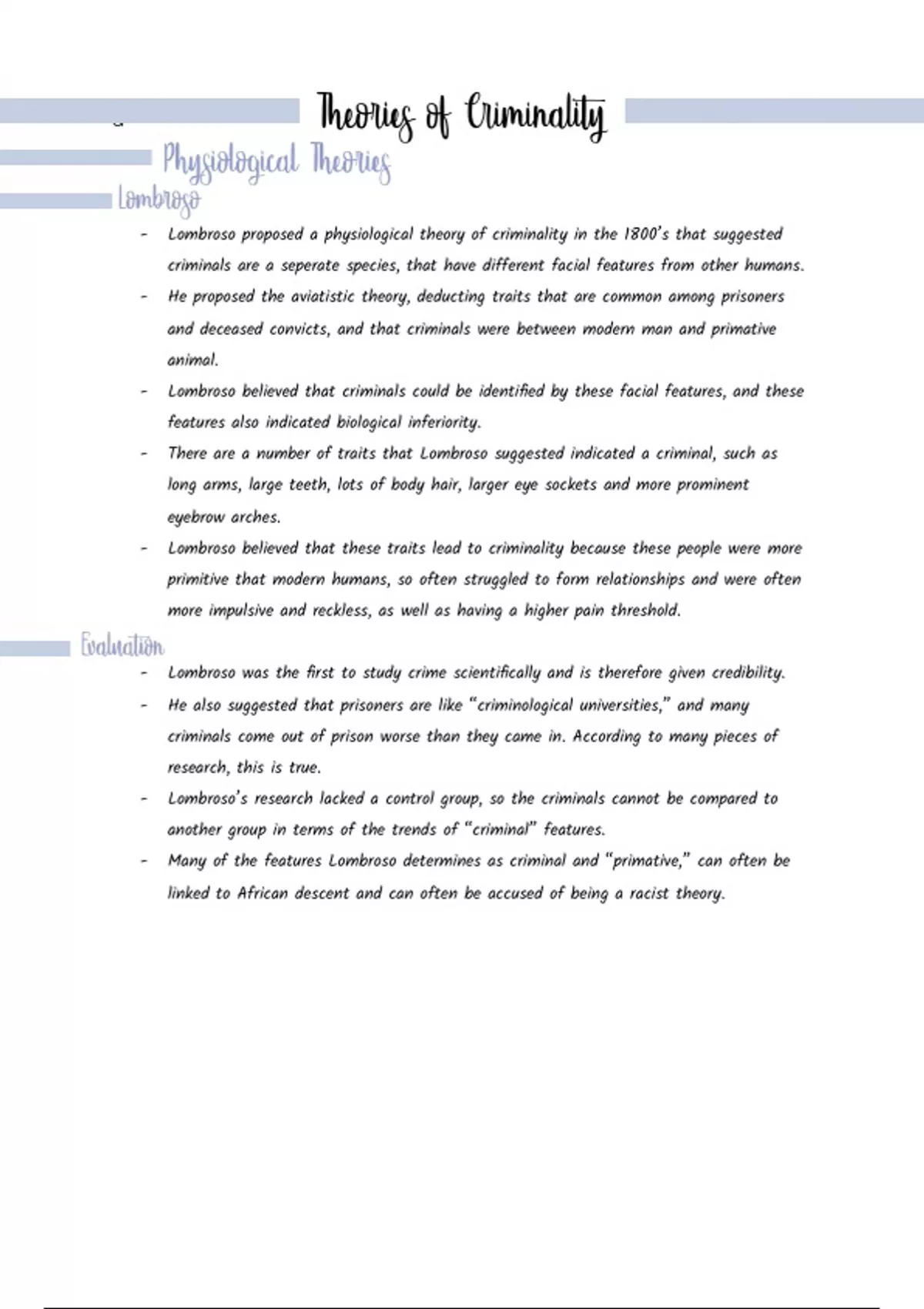 - Lombroso proposed a physiological theory of criminality in the 1800’s that suggested