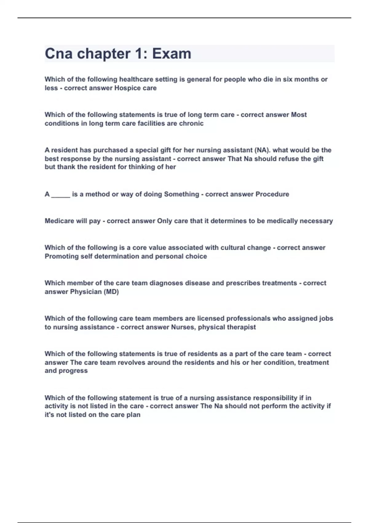 Which of the following healthcare setting is general for people who die in six months or less Hospice care Which of the following statements is true of long term care Most conditions in long term care facilities are chronic A resident has purchased a special gift for her nursing assistant (NA). what would be the best response by the nursing assistant That Na should refuse the gift but thank the resident for thinking of her A _____ is a method or way of doing Something Procedure Medicare will pay Only care that it determines to be medically necessary Which of the following is a core value associated with cultural change Promoting self determination and personal choice Which member of the care team diagnoses disease and prescribes treatments Physician (MD) Which of the following care team members are licensed professionals who assigned jobs to nursing assistance Nurses, physical therapist Which of the following statements is true of residents as a part of the care team The care team revolves around the residents and his or her condition, treatment and progress Which of the following statement is true of a nursing assistance responsibility if in activity is not listed in the care The Na should not perform the activity if it's not listed on the care plan A nursing assistant tells A resident that her grandchildren are noisy and disrupt The facility and suggested that next time her daughter visits, she should leave the kids at home. Which residents rights might this behavior violate ? The right to have visitors What is one reason why reporting a resident changes and problems to the nurse is a very important role of the nursing assistant The care plan must be updated as the residence conditions change Which of the following is a typical test that an NA performs Help residents with toilets need Which of the following tasks is outside the scope of practice for NA ? Inserting a tube into resident body A professional relationship between an NA and a resident includes Keeping residents information confidential Which of the following is an example of an NA having a professional relationship with an employer Documenting carefully