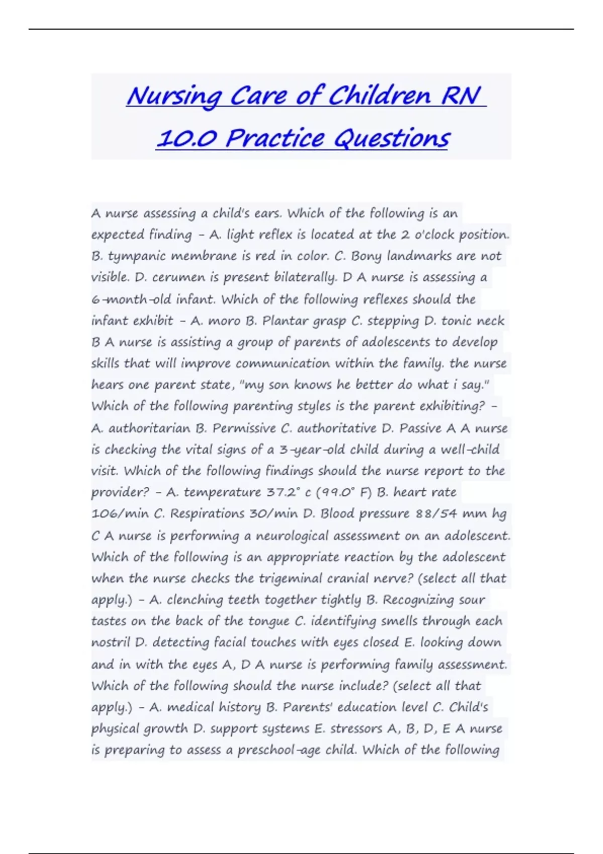 Nursing Care of Children RN 10.0 Practice Questions