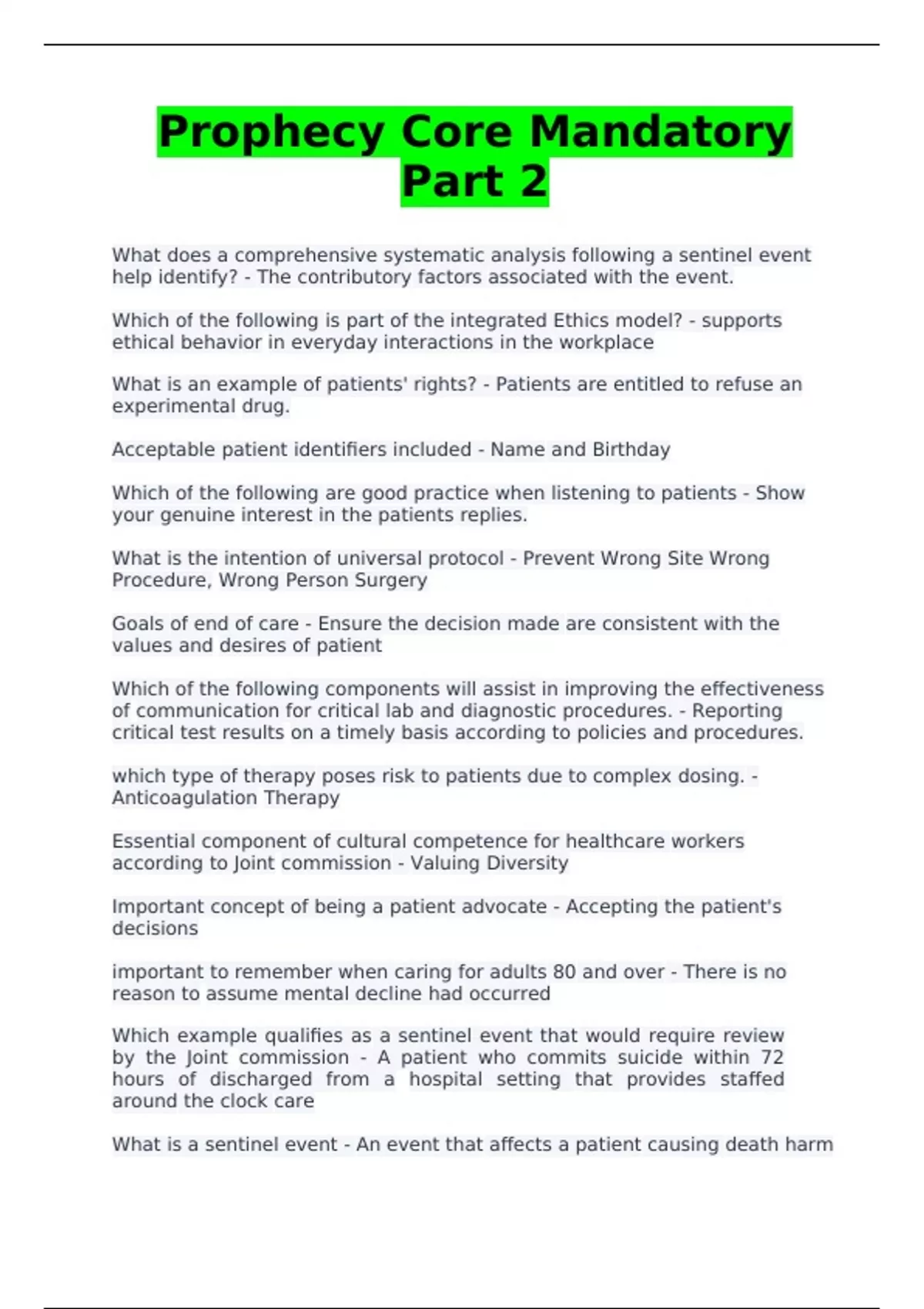 What does a comprehensive systematic analysis following a sentinel event help identify? - The contributory factors associated with the event. Which of the following is part of the integrated Ethics model? - supports ethical behavior in everyday interactions in the workplace What is an example of patients' rights? - Patients are entitled to refuse an experimental drug.