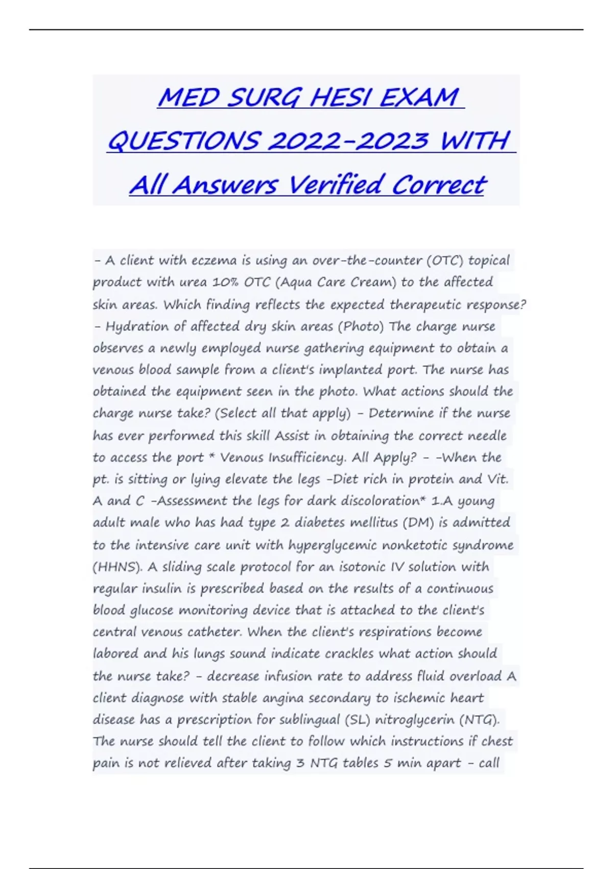 - A client with eczema is using an over-the-counter (OTC) topical product with urea 10% OTC (Aqua Care Cream) to the affected skin areas. Which finding reflects the expected therapeutic response? - Hydration of affected dry skin areas (Photo) The charge nurse observes a newly employed nurse gathering equipment to obtain a venous blood sample from a client's implanted port. The nurse has obtained the equipment seen in the photo. What actions should the charge nurse take? (Select all that apply) - Determine if the nurse has ever performed this skill Assist in obtaining the correct needle to access the port * Venous Insufficiency. All Apply? - -When the