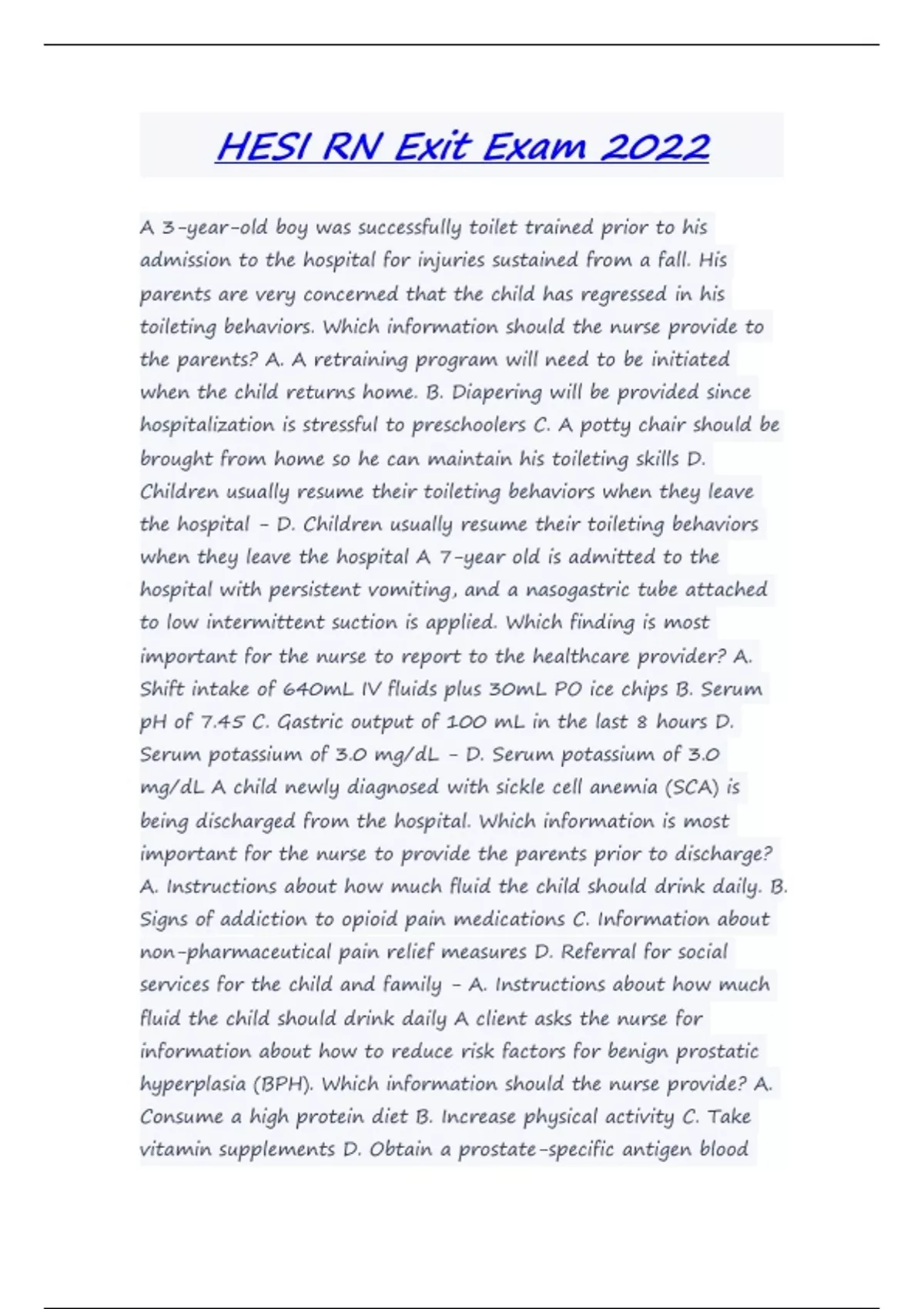 A 3-year-old boy was successfully toilet trained prior to his admission to the hospital for injuries sustained from a fall. His parents are very concerned that the child has regressed in his toileting behaviors. Which information should the nurse provide to the parents? A. A retraining program will need to be initiated when the child returns home. B. Diapering will be provided since hospitalization is stressful to preschoolers C. A potty chair should be brought from home so he can maintain his toileting skills D. Children usually resume their toileting behaviors when they leave the hospital - D. Children usually resume their toileting behaviors when they leave the hospital A 7-year old is admitted to the hospital with persistent vomiting, and a nasogastric tube attached to low intermittent suction is applied. Which finding is most important for the nurse to report to the healthcare provider? A. Shift intake of 640mL IV fluids plus 30mL PO ice chips B. Serum pH of 7.45 C. Gastric output of 100 mL in the last 8 hours D. Serum potassium of 3.0 mg/dL - D. Seru
