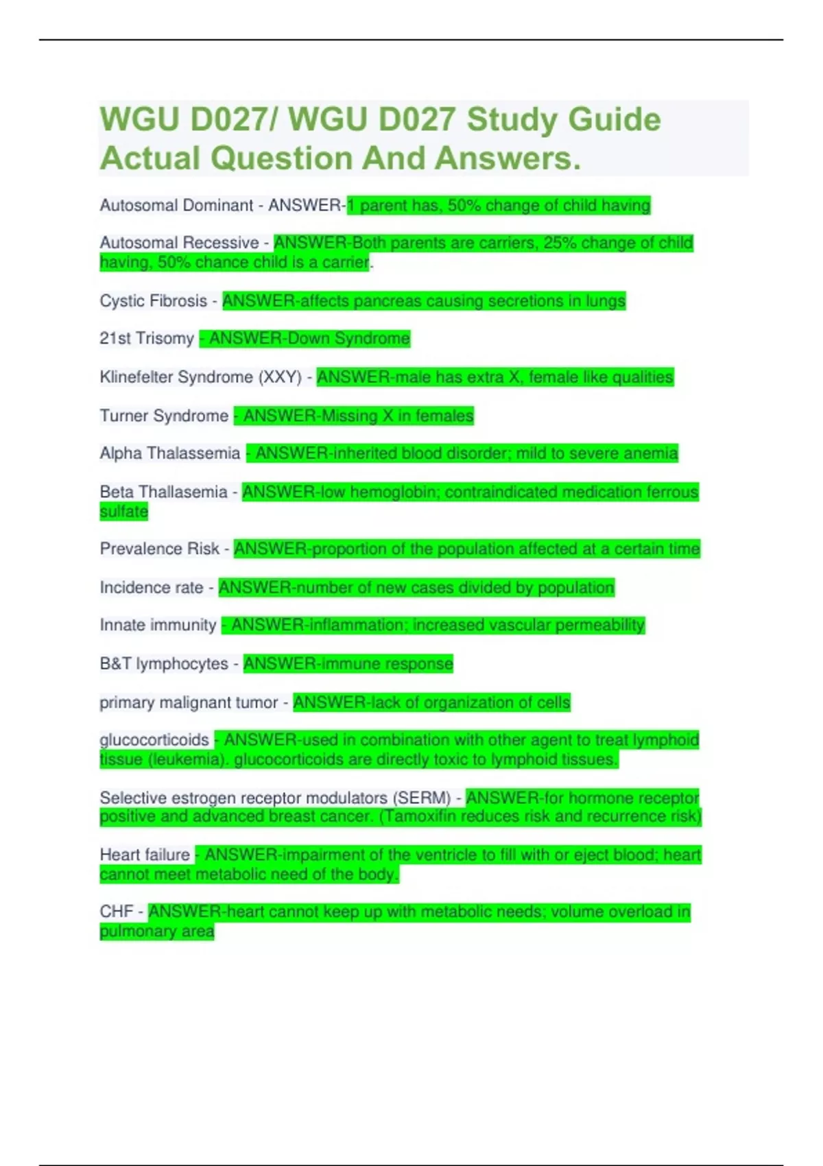 WGU D027/ WGU D027 Study Guide Actual Question And Answers. Autosomal Dominant - ANSWER-1 parent has, 50% change of child having Autosomal Recessive - ANSWER-Both parents are carriers, 25% change of child having, 50% chance child is a carrier.