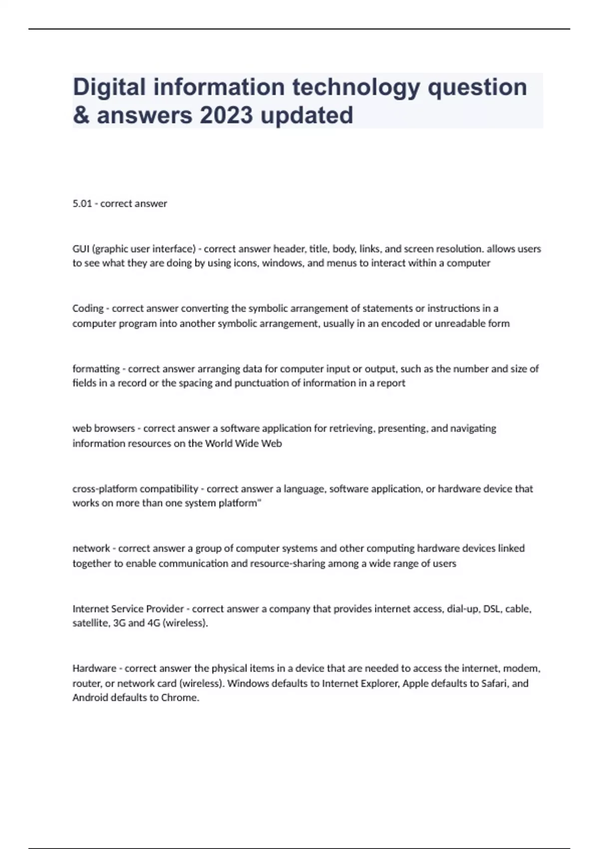 Digital information technology question & answers 2023 updated5.01 - correct answer GUI (graphic user interface) - correct answer header, title, body, links, and screen resolution. allows users to see what they are doing by using icons, windows, and menus to interact within a computer Coding - correct answer converting the symbolic arrangement of statements or instructions in a computer program into another symbolic arrangement, usually in an encoded or unreadable form formatting - correct answer arranging data for computer input or output, such as the number and size of fields in a record or the spacing and punctuation of information in a report web browsers - correct answer a software application for retrieving, presenting, and navigating information resources on the World Wide Web cross-platform compatibility - correct answer a language, software application, or hardware device that works on more than one system platform" network - correct answer a group of computer systems and other computing hardware devices linked together to enable communication and resource-sharing among a wide range of users Internet Service Provider - correct answer a company that provides internet access, dial-up, DSL, cable, satellite, 3G and 4G (wireless). Hardware - correct answer the physical items in a device that are needed to access the internet, modem, router, or network card (wireless). Windows defaults to Internet Explorer, Apple defaults to Safari, and Android defaults to Chrome.