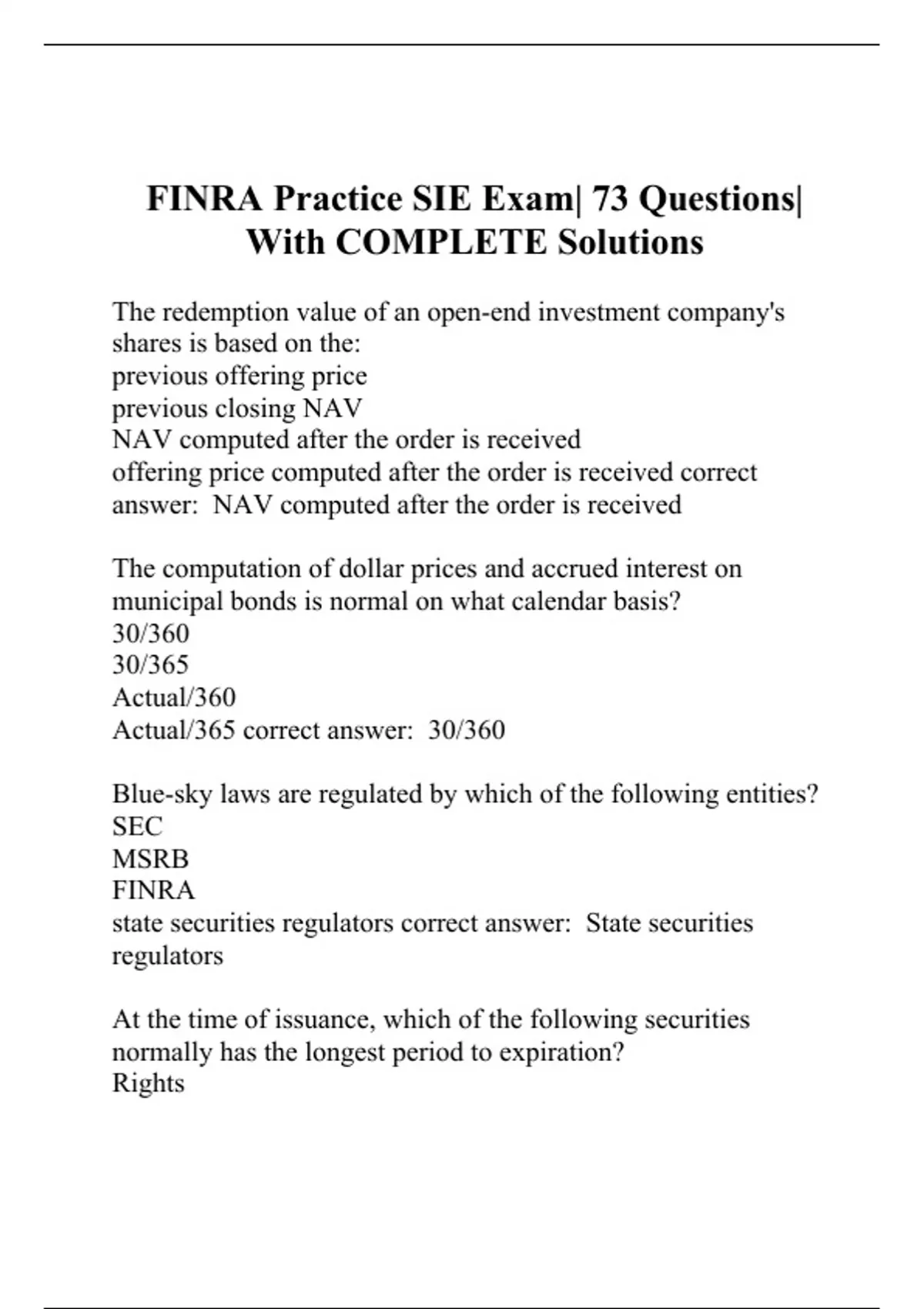 The redemption value of an open-end investment company's shares is based on the: previous offering price previous closing NAV NAV computed after the order is received offering price computed after the order is received correct answer: NAV computed after the order is received The computation of dollar prices and accrued interest on municipal bonds is normal on what calendar basis? 30/360 30/365 Actual/360 Actual/365 correct answer: 30/360 Blue-sky laws are regulated by which of the following entities? SEC MSRB FINRA state securities regulators correct answer: State securities regulators At the time of issuance, which of the following securities normally has the longest period to expiration? Rights Options