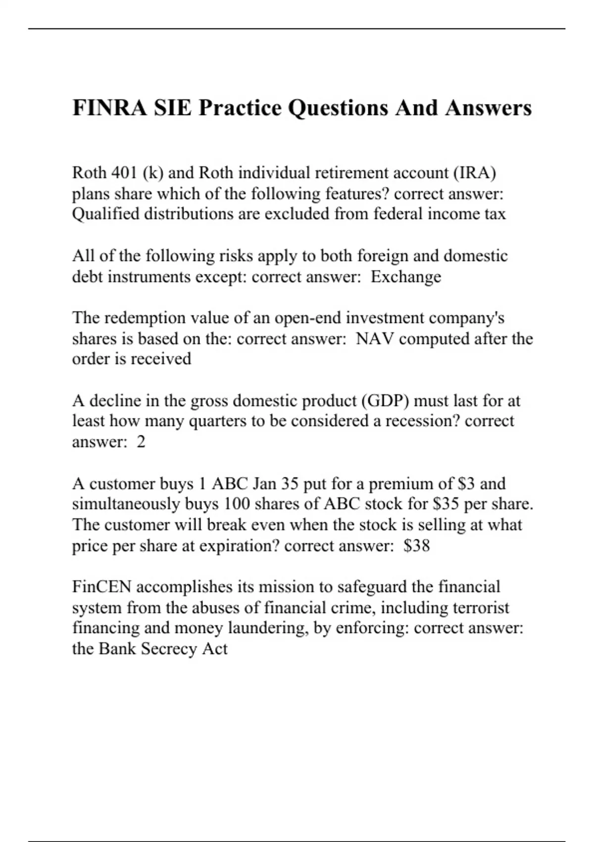 Roth 401 (k) and Roth individual retirement account (IRA) plans share which of the following features? correct answer: Qualified distributions are excluded from federal income tax All of the following risks apply to both foreign and domestic debt instruments except: correct answer: Exchange The redemption value of an open-end investment company's shares is based on the: correct answer: NAV computed after the order is received A decline in the gross domestic product (GDP) must last for at least how many quarters to be considered a recession? correct answer: 2 A customer buys 1 ABC Jan 35 put for a premium of $3 and simultaneously buys 100 shares of ABC stock for $35 per share. The customer will break even when the stock is selling at what price per share at expiration? correct answer: $38 FinCEN accomplishes its mission to safeguard the financial system from the abuses of financial crime, including terrorist financing and money laundering, by enforcing: correct answer: the Bank Secrecy Act