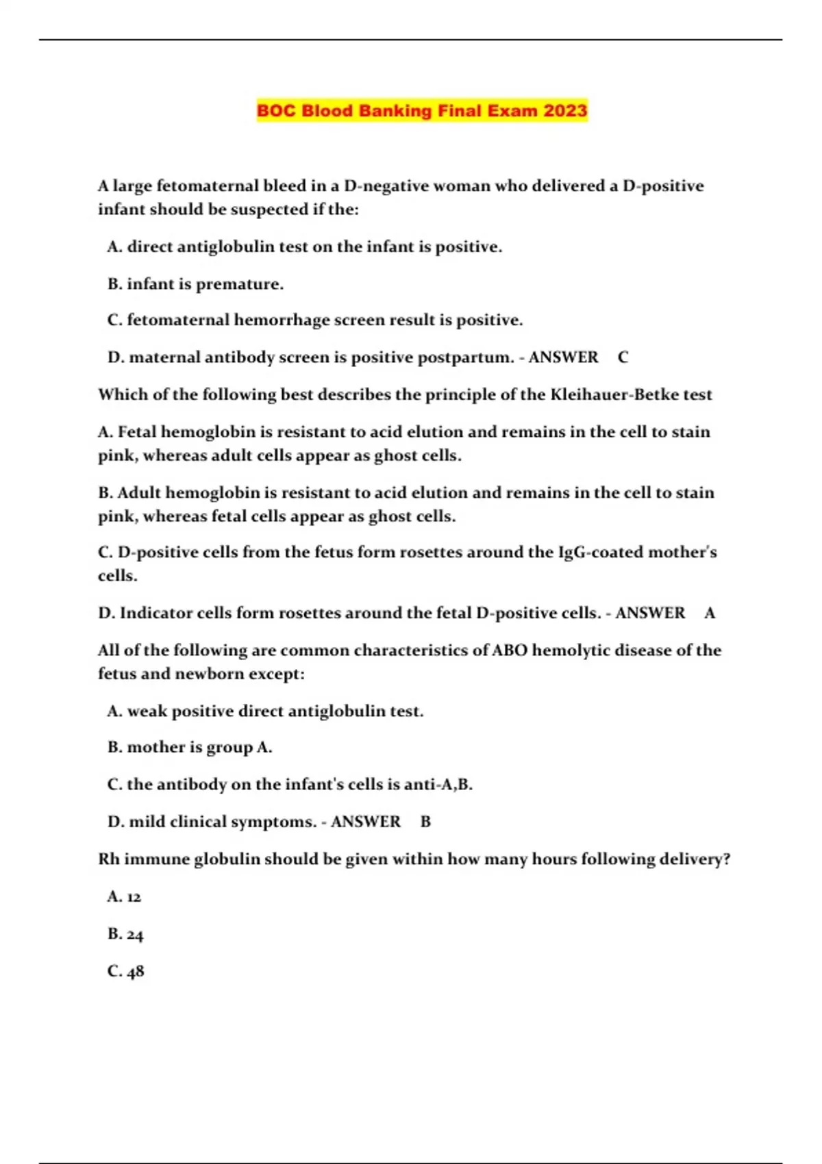 BOC Blood Banking Final Exam 2023