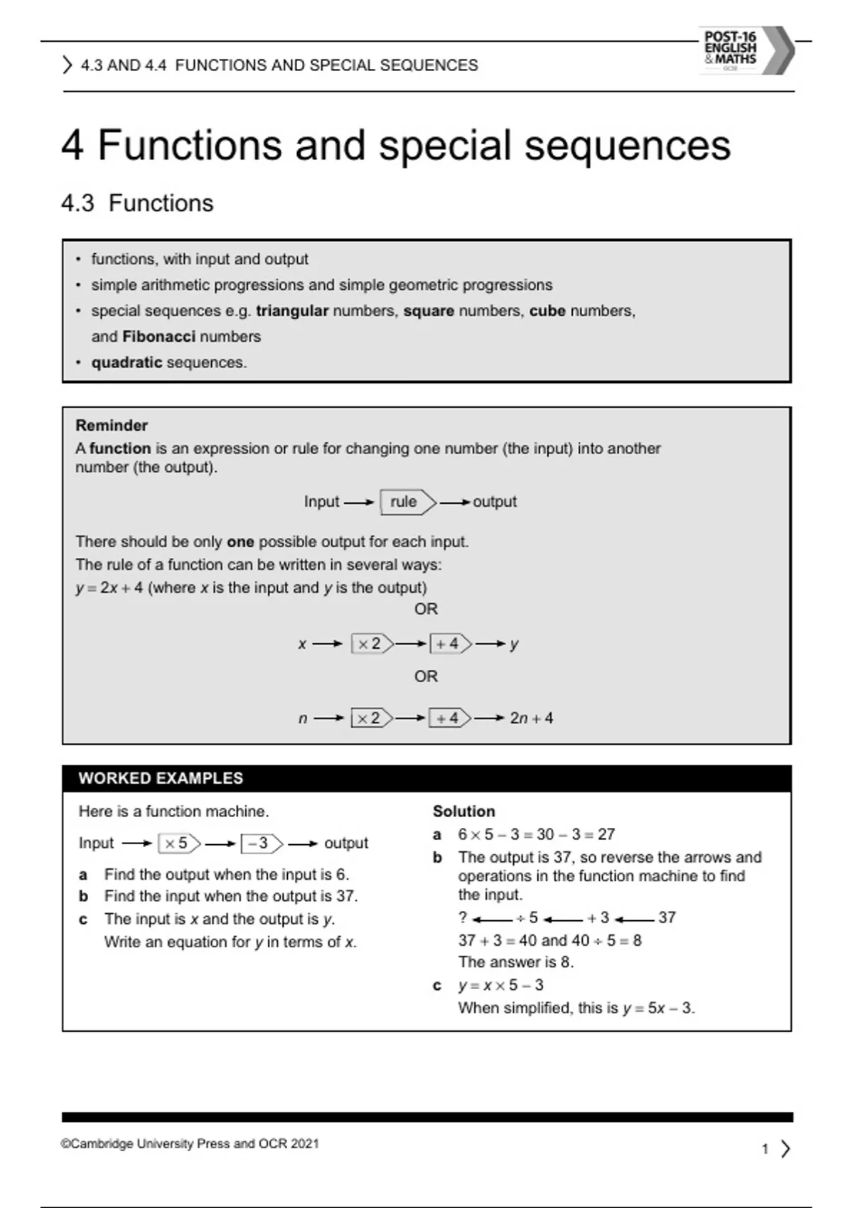 4.3 AND 4.4 FUNCTIONS AND SPECIAL SEQUENCES ©Cambridge University Press and OCR 2021 2 Exercise 1 1 Here is a function. x ÷ 4 + 9 y The input is x and the output is y. Write an algebraic equation for y in terms of x. 2 Write the equation that connects the input (x) with the output (y). a x square × 2 y b x × 2 square y 3 The diagram shows a sequence of patterns. Pattern 1 Pattern 2 Pattern 3 Pattern 4 a Work out the number of circles in Pattern 8. b Complete the rule. Pattern number × .... + .... number of circles c Which pattern number has 40 circles? 4 Here are the first four patterns in a sequence. a How many white circles will there be in pattern 10? b What is the expression for the number of white circles in pattern n? c Write an expression for the total number of circles in pattern n. input output input output 4.3 AND 4.4 FUNCTIONS AND SPECIAL SEQUENCES ©Cambridge University Press and OCR 2021 3 Reminder An arithmetic sequence (also known as an arithmetic progression) is a sequence where the difference between each term is constant. For example: 2 4 6 8 + 2 + 2 + 2 A geometric sequence (also known as a geometric progression) has terms that are multiplied or divided by a constant to get the next term in the sequence. For example, 2, 4, 8, 16 or 16, 8, 4, 2, 1, 5 a An arithmetic progression has an nth term Work out the first five terms of this progression. b A geometric progression has an nth term . Work out the first five terms of this progression. c The first 4 terms of a sequence are Is the sequence arithmetic or geometric? 6 For each of these sequences, state if it is arithmetic or geometric. a 2, 3, 4, 5, … b 1, 2, 4, 8, … c d 4.4 Special sequences Reminder You need to be able to recognise the following sequences: Fibonacci sequences, e.g. 1, 1, 2, 3, 5, 8, 13, ... The next term is found by adding the previous two terms. Quadratic sequences have nth term rules that contain . The sequence for triangular numbers is 1, 3, 6, 10, 15, ... It is made from the pattern below. The sequence for square numbers is or 1, 4, 9, 16, … The sequence for cube numbers is or 1, 8, 27, 64, …