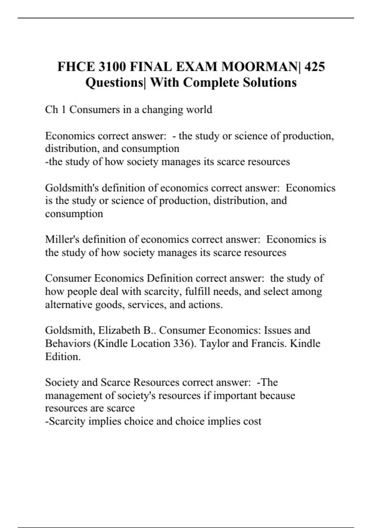 Ch 1 Consumers in a changing world Economics correct answer: - the study or science of production, distribution, and consumption -the study of how society manages its scarce resources Goldsmith's definition of economics correct answer: Economics is the study or science of production, distribution, and consumption Miller's definition of economics correct answer: Economics is the study of how society manages its scarce resources Consumer Economics Definition correct answer: the study of how people deal with scarcity, fulfill needs, and select among alternative goods, services, and actions. Goldsmith, Elizabeth B.. Consumer Economics: Issues and Behaviors (Kindle Location 336). Taylor and Francis. Kindle Edition. Society and Scarce Resources correct answer: -The management of society's resources if important because resources are scarce -Scarcity implies choice and choice implies cost Scarcity correct answer: -society has limited resources and therefore cannot produce all the goods and services people wish to have -Not enough resources are available to satisfy one's nee