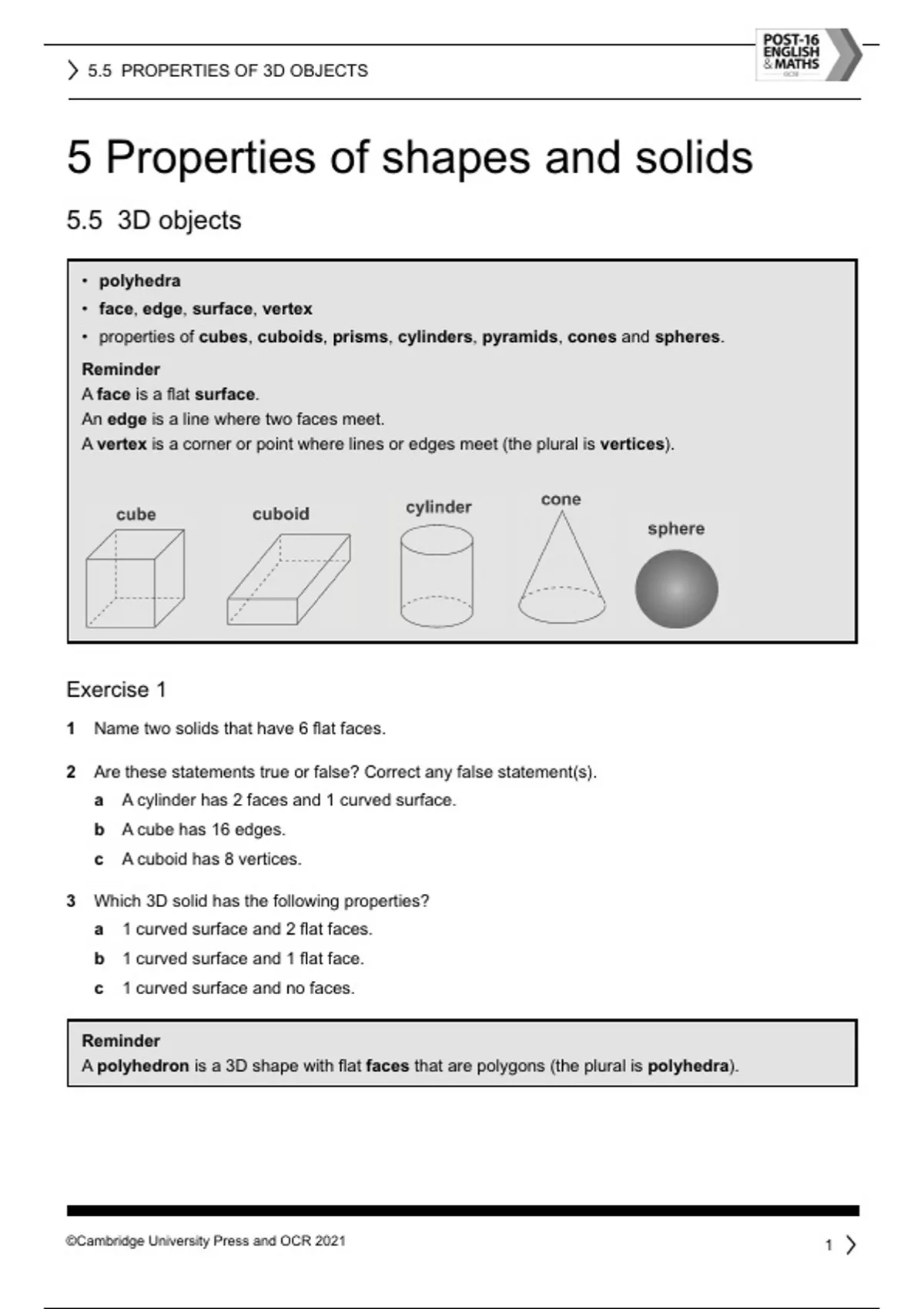 OCR GCSE MATHS 5.5 PROPERTIES OF 3D OBJECTS QUESTIONNSWERS EXAM A+ GRADED (PROPERTIES OF SHAPES AND SOLIDS)S AND A