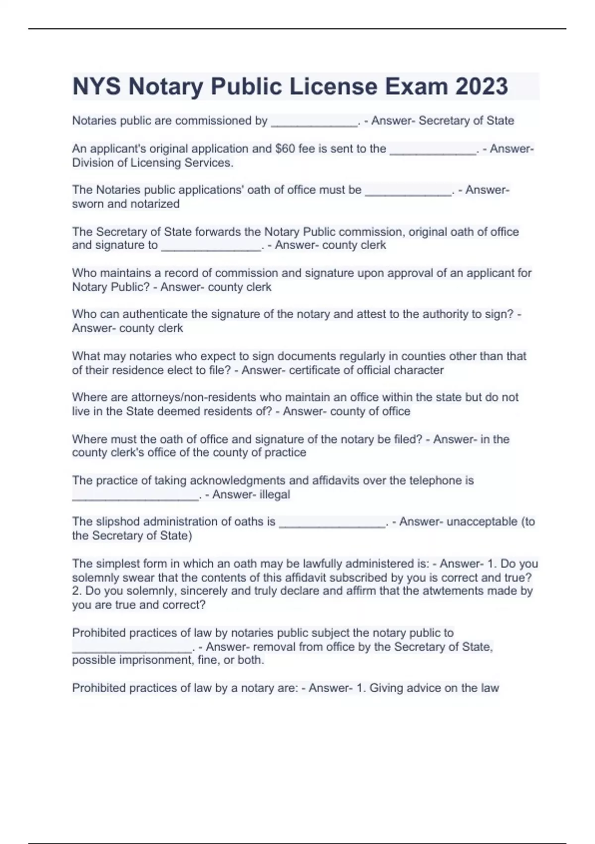 Notaries public are commissioned by _____________. - Answer- Secretary of State An applicant's original application and $60 fee is sent to the _____________. - Answer- Division of Licensing Services. The Notaries public applications' oath of office must be _____________. - Answer- sworn and notarized The Secretary of State forwards the Notary Public commission, original oath of office and signature to _______________. - Answer- county clerk Who maintains a record of commission and signature upon approval of an applicant for Notary Public? - Answer- county clerk Who can authenticate the signature of the notary and attest to the authority to sign? - Answer- county clerk What may notaries who expect to sign documents regularly in counties other than that of their residence elect to file? - Answer- certificate of official character Where are attorneys/non-residents who maintain an office within the state but do not live in the State deemed residents of? - Answer- county of office Where must the oath of office and signature of the notary be filed? - Answer- in the county clerk's office of the county of practice The practice of taking acknowledgments and affidavits over the telephone is ___________________. - Answer- illegal The slipshod administration of oaths is ________________. - Answer- unacceptable (to the Secretary of State) The simplest form in which an oath may be lawfully administered is: - Answer- 1. Do you solemnly swear that the contents of this affidavit subscribed by you is correct and true? 2. Do you solemnly, sincerely and truly declare and affirm that the atwtements made by you are true and correct? Prohibited practices of law by notaries public subject the notary public to __________________. - Answer- removal from office by the Secretary of State, possible imprisonment, fine, or both. Prohibited practices of law by a notary are: - Answer- 1. Giving advice on the law 2. Asking for and getting legal business to send to a lawyer from whom he receives any money/consideration 3. Dividing legal fees with a lawyer 4. Advertising or circulating any ad with rights not given to the notary. A notary public is cautioned not to/has no authority to execute an acknowledgment of the execution of a _______________. - Answer- will, marriage Why shouldn't notaries public execute an acknowledgment of execution of a will? - Answer- It cannot be deemed equivalent to an attestation clause accompanying a will. It is also an invasion of the legal profession. A nonresident with no office or place of business in this state does what? - Answer- vacates office A resident of NYS that moves out of the state and does not retain an office or place of business in state does what? - Answer- vacates office A non-resident who does not maintain an office in NYS who accepts the office of notary public does what? - Answer- appoints the Secretary of State to serve upon his behalf Unless an attorney, the Secretary of State shall satisfy himself that the applicant is - Answer- 1. of good moral character 2. has the equivalent of a common school education 3. is familiar with the duties and responsibilities of a notary public The notary public must apply for reappointment within how long of expiration to waive qualifying requirements by the Secretary of State? - Answer- 6 months The notary public who is enlisted in the armed forces must apply for reappointment within how long of expiration and military discharge (not dishonorable) to waive qualifying requirements by the Secretary of State? - Answer- 1 year Who may suspend or remove any notary from office for misconduct? - Answer- Secretary of State What must be done before a Secretary of State can suspend or remove a notary from office for misconduct? - Answer- The notary public must be served with a copy of the charges and have an opportunity to be heard. Can a person be appointed as a notary public if they have been convicted of a crime? - Answer- Yes (if the Secretary of State finds the convictions do not constitute a bar to appointment, e.g. by obtaining an executive pardon, a certificate of relief from disabilities, or a certificate of good conduct from the parole board) Applicants for a notary public commission should submit their application with oath of office (duly executed) with their signature to the ____________________. - Answer- Secretary of State How much is the non-refundable application fee that is sent to the Secretary of State? - Answer- $60 What information is contained on the notary public identification card? - Answer- appointee's name, address, county and commission term What will the Secretary of State send to the county clerk upon application and approval of appointment? - Answer- the commission (duly dated), oath of office (original or certified copy), official signature, and $20 apportioned from the application fee (by the 10th day of the following month) The county clerk, upon application approval, will make a proper index of what? - Answer- commissions and official signatures Applicants for reappointment should submit their application and oath of office to the ______________________. - Answer- county clerk Who will issue the commission for reappointment? - Answer- county clerk What will the county clerk send to the Secretary of State upon application and approval of reappointment? - Answer- the commission, oath of office (original or certified copy), official signature, and $40 apportioned from the application fee (plus interest as required by NYS) (by the 10th day of the following month) The Secretary of State, upon application reapproval, will make a proper index of what? - Answer- commissions A duplicate ID card may be issued upon what? - Answer- an ID card lost, destroyed or damaged Each duplicate ID card will have what? - Answer- the word "duplicate" stamped across the face and the same number as the one it replaces Who may certify to the official character of the notary public? - Answer- the Secretary of State or county clerk How muc