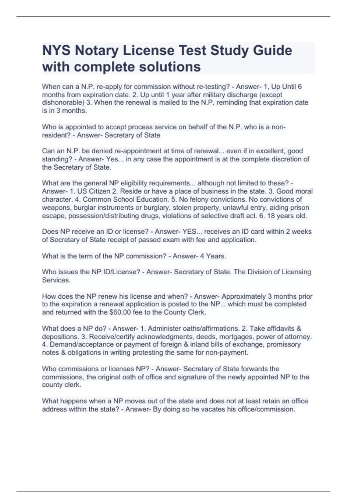 NYS Notary License Test Study Guide with complete solutions