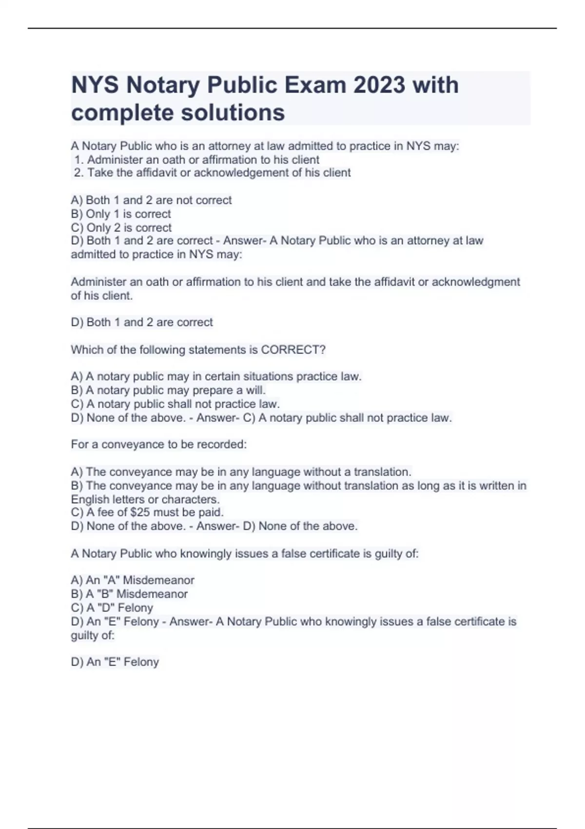A Notary Public who is an attorney at law admitted to practice in NYS may: 1. Administer an oath or affirmation to his client 2. Take the affidavit or acknowledgement of his client A) Both 1 and 2 are not correct B) Only 1 is correct C) Only 2 is correct D) Both 1 and 2 are correct - Answer- A Notary Public who is an attorney at law admitted to practice in NYS may: Administer an oath or affirmation to his client and take the affidavit or acknowledgment of his client. D) Both 1 and 2 are correct Which of the following statements is CORRECT? A) A notary public may in certain situations practice law. B) A notary public may prepare a will. C) A notary public shall not practice law. D) None of the above. - Answer- C) A notary public shall not practice law. For a conveyance to be recorded: A) The conveyance may be in any language without a translation. B) The conveyance may be in any language without translation as long as it is written in English letters or characters. C) A fee of $25 must be paid. D) None of the above. - Answer- D) None of the above. A Notary Public who knowingly issues a false certificate is guilty of: A) An "A" Misdemeanor B) A "B" Misdemeanor C) A "D" Felony D) An "E" Felony - Answer- A Notary Public who knowingly issues a false certificate is guilty of: D) An "E" Felony A signed statement that is sworn to by the creator in front of a Notary Public is called _______________________. A) A Codicil B) A Lein C) A Contract D) An Affidavit - Answer- A signed statement that is sworn to by the creator in front of a Notary Public is called _______________________. D) An Affidavit A _________ is the section on an affidavit where a Notary certifies that the statement was sworn in front of him. A) Codicil B) Appendix C) Preamble D) Jurat - Answer- A _________ is the section on an affidavit where a Notary certifies that the statement was sworn in front of him. D) Jurat For a conveyance of real property to be recorded: 1. It must be in the English language in all cases. 2. Proper names must be in foreign characters A) Only 1 is correct. B) Both 1 and 2 are correct. C) Only 2 is correct. D) Both 1 and 2 are not correct. - Answer- D) Both 1 and 2 are not correct. An authentication by Department of State attached to a county-certified document to be used internationally is called __________________. A) A Certified Copy B) An Attestation C) An Apostile D) None of the Above - Answer- An authentication by Department of State attached to a county-certified document to be used internationally is called ________________. C) An Apostile