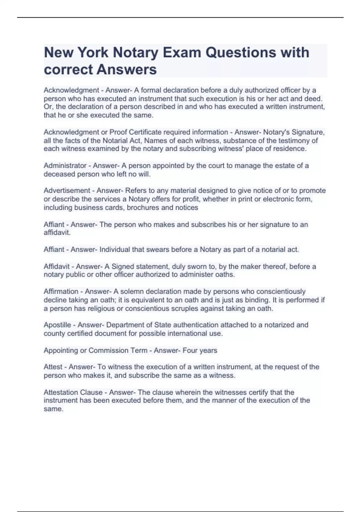 Acknowledgment - Answer- A formal declaration before a duly authorized officer by a person who has executed an instrument that such execution is his or her act and deed. Or, the declaration of a person described in and who has executed a written instrument, that he or she executed the same. Acknowledgment or Proof Certificate required information - Answer- Notary's Signature, all the facts of the Notarial Act, Names of each witness, substance of the testimony of each witness examined by the notary and subscribing witness' place of residence. Administrator - Answer- A person appointed by the court to manage the estate of a deceased person who left no will. Advertisement - Answer- Refers to any material designed to give notice of or to promote or describe the services a Notary offers for profit, whether in print or electronic form, including business cards, brochures and notices Affiant - Answer- The person who makes and subscribes his or her signature to an affidavit. Affiant - Answer- Individual that swears before a Notary as part of a notarial act. Affidavit - Answer- A Signed statement, duly sworn to, by the maker thereof, before a notary public or other officer authorized to administer oaths. Affirmation - Answer- A solemn declaration made by persons who conscientiously decline taking an oath; it is equivalent to an oath and is just as binding. It is performed if a person has religious or conscientious scruples against taking an oath. Apostille - Answer- Department of State authentication attached to a notarized and county certified document for possible international use. Appointing or Commission Term - Answer- Four years Attest - Answer- To witness the execution of a written instrument, at the request of the person who makes it, and subscribe the same as a witness. Attestation Clause - Answer- The clause wherein the witnesses certify that the instrument has been executed before them, and the manner of the execution of the same. Authentication - Answer- A Certificate subjoined by a county clerk to any certificate of acknowledge or proof or oath signed by a notary. Bill of Sale - Answer- A written instrument given to pass title of personal property from vendor to vendee. Certificate of acknowledgment for a conveyance required information - Answer- Venue and Date of the Notarial Act, Names of undersigned who appeared before the Notary and are subscribed in the document, substance or details of the act, all blank spaces and information required by law must be properly filled in. Certificate of Authentication - Answer- A Certificate issue by the county clerk's office that when attached to any certificate of proof, acknowledgment or jurat, authenticates the Notary's signature on a document and attests to the Notary's authority to sign at the same time of notarization. Certificate of Official Character - Answer- A Certificate that authenticates a Notary signature and it is issue by the Secretary of State or the county clerk. Certified Copy - Answer- A copy which is marked in some official way to show that it is a true copy of the original document. Deposition - Answer- Testimony of a witness taken out of court or other hearing proceeding, under oath or by affirmation, before a notary public or other person, officer or commissioner before whom such testimony is authorized by law to be taken, which is intended to be used at the trial or hearing. Oath - Answer- A verbal pledge given by the person taking it that his or her statements are made under immediate sense of his or her responsibility to God, who will punish the affiant if the statements are false. Protest - Answer- A formal statement in writing by a notary public, under seal, that a certain bill of exchange or promissory note was on a certain day presented for payment, or acceptance, and that such payment or acceptance was refused. Change of Name Notice - Answer- Notaries must submit this form along with a non-refundable fee of $10 in case he or she wants to officially change their name for any reason Jurat - Answer- The section of an affidavit where the officer (Notary Public) certifies that it was sworn to before him or her. An Affidavit's certificate. Chattel - Answer- Personal property, such as household goods or fixtures. Chattel Paper - Answer- A writing or writings which evidence both an obligation to pay money and a security interest in a lease or specific goods. Codicil - Answer- An instrument made subsequent to a will and modifying it in some respects. Commissioning Body - Answer- Office of The Secretary of State Consideration - Answer- Anything of value given to induce entering into a Contract; it may be money, personal services, or even love and affection. Contempt of Court - Answer- Behavior Disrespectful of the authority of a court which disrupts the execution of court orders. Contract - Answer- An agreement between competent parties to do or not to do certain things for a legal consideration, whereby each party acquires a right to what the other possesses. Conveyance (Deed) - Answer- Every instrument, in writing, except a will, by which any estate or interest in real property is created, transferred, assigned or surrendered. Conveyance of Real Property - Answer- Must be in English or Have a translation to English attached to it and the translations must be either signed and acknowledge by the author or proved by a subscribing witness or someone designated for that purpose by the county judge. County Law - Answer- Stipulates that each county clerk must designate at least one staff member to serve as a Notary Public Deponent - Answer- One who makes oath to a written statement. technically, a person subscribing a deposition but used interchangeable with "Affiant" Duress - Answer- Unlawful constraint exercised upon a person whereby he is forced to do some act against his will. Escrow - Answer- The placing of an instrument in the hands of a person as a depository who on the happening of a designated event, is to deliver the 