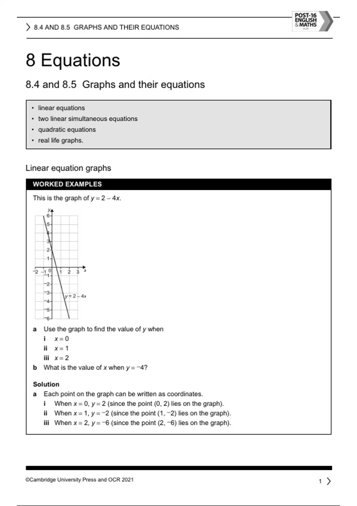 8.4 and 8.5 Graphs and their equations ©Cambridge University Press and OCR 2021 1 8 Equations 8.4 and 8.5 Graphs and their equations • linear equations • two linear simultaneous equations • quadratic equations • real life graphs. Linear equation graphs WORKED EXAMPLES This is the graph of y = 2 − 4x. a Use the graph to find the value of y when i x = 0 ii x = 1 iii x = 2 b What is the value of x when y = −4? Solution a Each point on the graph can be written as coordinates. i When x = 0, y = 2 (since the point (0, 2) lies on the graph). ii When x = 1, y = −2 (since the point (1, −2) lies on the graph). iii When x = 2, y = −6 (since the point (2, −6) lies on the graph). 8.4 and 8.5 Graphs and their equations ©Cambridge University Press and OCR 2021 2 b Find −4 on the y-axis. Draw a horizontal straight line to the graph and then a vertical straight line up to the x-axis. Write down this value of x. The answer is x = 1.5. Exercise 1 TIP When you solve an equation, you are finding its solution(s). Another name for solution(s) is root(s). 1 Use this graph of the equation y = 3x − 2 to find the value of y for the following values. a x = 0 b x = 1 c x = 2 8.4 and 8.5 Graphs and their equations ©Cambridge University Press and OCR 2021 3 2 Use this graph of the equation y = 2x + 2 to find the value of x for the following values. a y = −4 b y = 0 c y = 4 Two linear (simultaneous) equations WORKED EXAMPLE The diagram shows the graphs of two linear equations, y = 2x and y = −2x + 8. Use the graph to find the solution to the two equations. Solution The x and y coordinates of the intersection of the lines is the same as the solution to the simultaneous equations if solved algebraically. In this case, the coordinates where the two lines cross is (2, 4), so the solution to the two equations is x = 2 and y = 4. 8.4 and 8.5 Graphs and their equations ©Cambridge University Press and OCR 2021 4 Exercise 2 1 These lines have equations: 2y + 3x = 12 and 2y − x = 4 Use the graph to find the solution to the equations if solved simultaneously