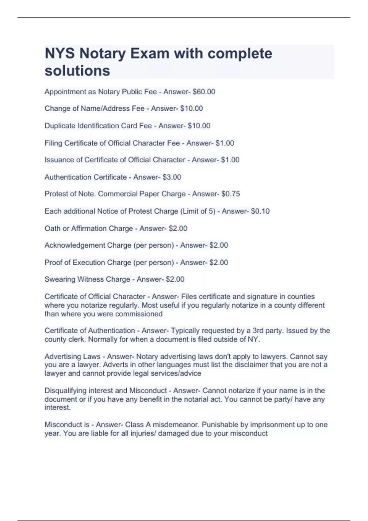 Appointment as Notary Public Fee - Answer- $60.00 Change of Name/Address Fee - Answer- $10.00 Duplicate Identification Card Fee - Answer- $10.00 Filing Certificate of Official Character Fee - Answer- $1.00 Issuance of Certificate of Official Character - Answer- $1.00 Authentication Certificate - Answer- $3.00 Protest of Note. Commercial Paper Charge - Answer- $0.75 Each additional Notice of Protest Charge (Limit of 5) - Answer- $0.10 Oath or Affirmation Charge - Answer- $2.00 Acknowledgement Charge (per person) - Answer- $2.00 Proof of Execution Charge (per person) - Answer- $2.00 Swearing Witness Charge - Answer- $2.00 Certificate of Official Character - Answer- Files certificate and signature in counties where you notarize regularly. Most useful if you regularly notarize in a county different than where you were commissioned Certificate of Authentication - Answer- Typically requested by a 3rd party. Issued by the county clerk. Normally for when a document is filed outside of NY. Advertising Laws - Answer- Notary advertising laws don't apply to lawyers. Cannot say you are a lawyer. Adverts in other languages must list the disclaimer that you are not a lawyer and cannot provide legal services/advice Disqualifying interest and Misconduct - Answer- Cannot notarize if your name is in the document or if you have any benefit in the notarial act. You cannot be party/ have any interest. Misconduct is - Answer- Class A misdemeanor. Punishable by imprisonment up to one year. You are liable for all injuries/ damaged due to your misconduct Notaries Public can be removed from office for: - Answer- Misstatement on application, False oath/ affirmation, misdemeanors (including lying about these during appointment or reappointment) Executive Law Misdemeanors - Answer- Practicing law or deceit, Falsely claiming to be a notary, acting as notary after removal, refusal to notarize, taking an acknowledgment over the phone Judiciary Law Misdemeanor - Answer- Pretending to be a lawyer, Accepting compensation for drafting legal docs, legal advice, Advertising/ telling ppl you have the rights of an attorney Notaries should NOT supervise the - Answer- Execution of a will. Is an invasion of the legal profession. An Acknowledgment is not the same as an Attestation Clause Certifying a false certificate is a - Answer- Class E felony. Can be punished with 3-4 years in prison Forgery in the 2nd degree is a - Answer- Class D Felony. This includes falsifying legal documents, public records, recordable documents, and public documents Subscribe - Answer- Writing one's name on a document in acknowledgment of being its creator Codicil - Answer- A written instrument that is made subsequent to a will and that modifies it in some respect Venue - Answer- Geographical place where a Notary Public takes an affidavit or acknowledgement Will - Answer- The disposition of one's property, to take effect after death Seal - Answer- The laws of the state of NY do not require its use by Notary Public, but if used, it should sufficiently identify the Notary Public and their authority & jurisdiction Consideration - Answer- Anything of value given to induce entering into a contract Litigation - Answer- The act of carrying on a lawsuit Chattel - Answer- Personal property, such as household goods or fixtures Attestation Clause - Answer- That clause (eg. at the end of a will) wherein the witnesses certify that the instrument was executed before them and the manner of the execution of the same